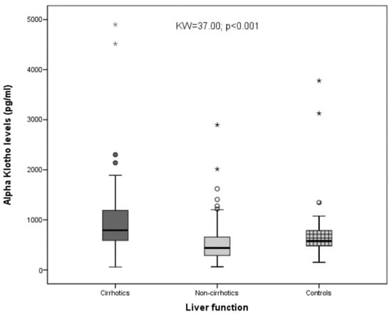 Among the whole sample, we observed that cirrhotics showed significantly higher Klotho values than non-cirrhotics. Non-cirrhotics showed significantly lower Klotho values when compared with the controls (with p < 0.05 with the SNK test). Globally, the differences were highly significant (with KW = 37.00 and p < 0.001; Figure 1).