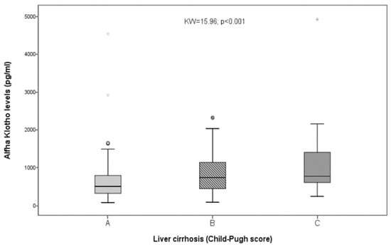 Klotho was significantly related to prothrombin activity (with ρ = −0.39 and p < 0.001), albumin (with ρ = −0.15 and p = 0.047), and bilirubin (with ρ = 0.26 and p < 0.001) but not to serum creatinine (with ρ = −0.03 and p = 0.72; NS). Marked differences were observed when Klotho was compared among the three Child’s groups (with KW = 15.96 and p < 0.001; Figure 2), and the patients belonging to the Child’s B or C groups showed significantly higher Klotho values (Z = 3.11; p = 0.002) than patients belonging to the Child A group. Klotho was also related to platelet count (ρ = −0.39; p < 0.001). Therefore, the Klotho values were higher among cirrhotics and were related to liver function impairment.