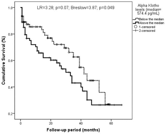Sixty-seven patients died during the follow-up period. Both age (with Z = 2.52 and p = 0.012) and Klotho (with Z = 2.46 and p = 0.014) were higher among those who died. Those patients with Klotho levels over the median showed a marginally significant trend to a higher mortality (with LR = 3.28, p = 0.07, Breslow = 3.87, and p = 0.049; Figure 3).