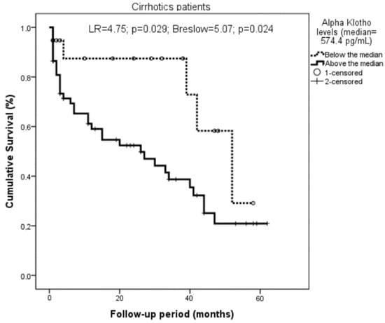 Relationship of Klotho with survival among the cirrhotics. Klotho levels were classified according to the median (574.4 pg/mL). Cirrhotic patients with Klotho values above the median showed higher mortality (LR = 4.75; p = 0.029; Breslow = 5.07; p = 0.024).