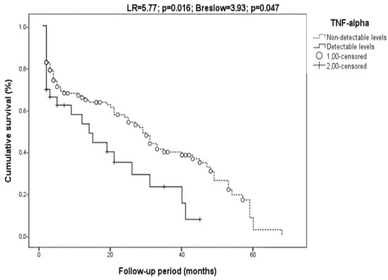 Relationship of the TNF-α with survival. The TNF-α levels were classified according to detectable or non-detectable levels. Patients with detectable TNF-α values showed higher mortality (LR = 5.77; p = 0.016; Breslow = 3.93; p = 0.047).