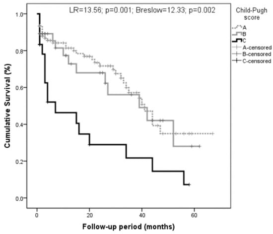 Relationship of the Child’s groups with survival. Patients with worse liver function (Child C) had higher mortality (LR = 13.56; p = 0.001; Breslow = 12.33; p = 0.002).