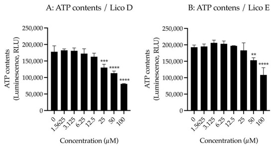 First, we examined the effect of Licos D and E on membrane permeability in SIM-A9 cells. Impaired membrane permeability induces cell death and, consequently, decreased ATP contents are observed. We, therefore, measured ATP contents after treatment with up to 100 µM of Licos D and E for 40 min in SIM-A9 cells. Licos D and E were observed to impair membrane permeability and decrease ATP contents at high concentrations above 25 µM (Figure 4A,B). Based on these results, we investigated the effect of Licos D and E on [3H]choline uptake at concentrations below 25 µM.