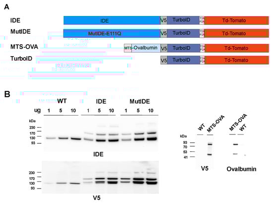 To verify the fusion protein expression, we analyzed the cell lysates by immunoblot (Figure 1B). Cells transduced with viruses encoding IDE displayed a band with the molecular weight expected for the fusion of IDE with TurboID (162 kDa), in addition to the endogenous IDE protein (118 kDa), and a minor band likely corresponding to the entire fusion protein including tdTomato (215 kDa). Consistent with this, major and minor bands corresponding to cleaved and uncleaved fusion proteins, respectively, were detected using an antibody to the V5 tag. An additional protein migrating just above the endogenous IDE protein and reacting with IDE and V5 antibodies may correspond to aberrant cleavage just downstream of the V5 tag. An analysis of cells expressing OVA revealed bands corresponding to the expected cleaved fusion protein (85 kDa) and a band (about 47 kDa) that may again correspond to cleavage just after the V5 tag.