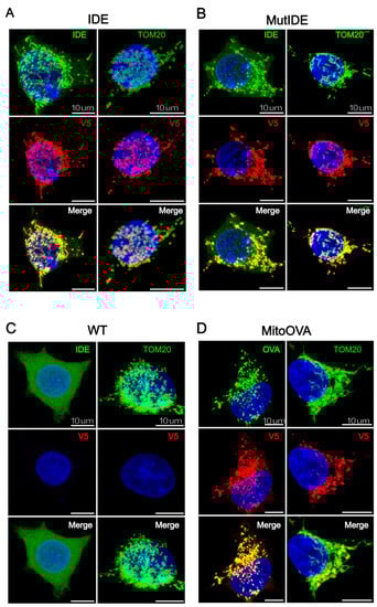 4 × 104 cells were seeded onto glass coverslips pre-coated with Poly-D-Lysine overnight. The cells were fixed for 12 min with a solution containing 4% paraformaldehyde, 0.2% glutaraldehyde, 60 mM PIPES (piperazine-N,N′-bis(2-ethanesulfonic acid)), 25 mM HEPES((4-(2-hydroxyethyl)-1-piperazineethanesulfonic acid), 10 mM EGTA (ethylene glycol-bis(β-aminoethyl ether)-N,N,N′,N′-tetraacetic acid), 2 mM Magnesium acetate, and then permeabilized with 0.2%Triton X-100 in DPBS (Dulbecco’s phosphate-buffered saline) for 10 min. After blocking with 5% donkey serum in PBS-0.05% Tween-20 for 2 h at RT (room temperature), the cells were incubated sequentially with primary antibodies overnight at 4 °C (IDE, V5, TOM20 all at 1:100), and with the appropriate secondary antibodies (1:200) for 2 h at RT (Table S1). Nuclear counterstaining was carried out using DAPI (4′,6-diamidino-2-phenylindole) at the concentration of 1 μg/mL. The slides were mounted with Vectashield Plus Antifade media. The image acquisitions were performed with a 63x oil immersion objective (NA 1.4) and a laser scanning confocal microscope (TCS SP8-3X STED; Leica Microsystems, Weztlar, Germany). The images were processed with Icy (https://icy.bioimageanalysis.org, accessed on 9 May 2022).