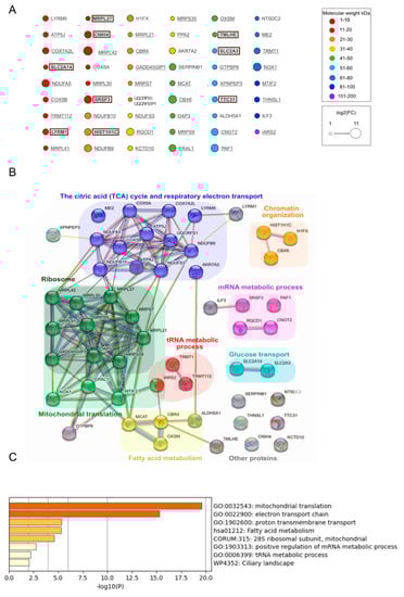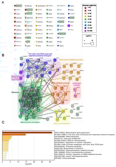 Interactome and functional enrichment analysis of MutIDE. (A) 53 enriched proteins, annotated in Figure 3, classified according to molecular weight (circle colors) and fold change (circle diameter); (B) Functionally associated protein networks in the MutIDE interactome as identified by STRING analysis; (C) Top non-redundant enrichment clusters in the MutIDE interactome, as identified by Metascape. A total of 24% of genes in GO:0032543 and 22% of genes in R-HSA1428517 were enriched. The color scale represents statistical significance levels expressed as −log10.