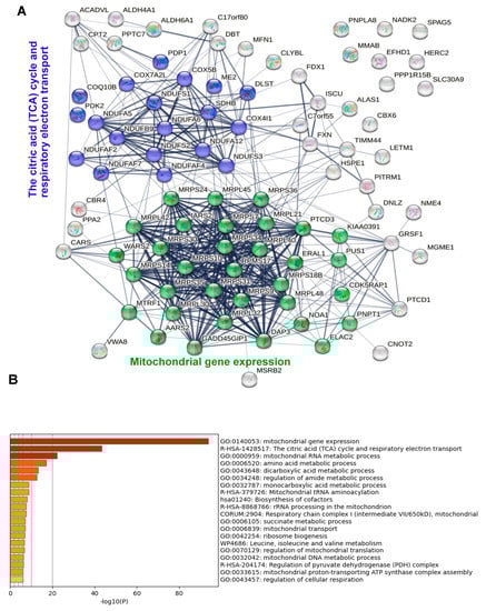 To identify known physical or functional interactions among the proteins identified, we used the STRING database and algorithm []. This revealed three functionally associated mitochondrial protein networks (Figure 3B): mitochondrial protein translation with 17 members, of which many are known to interact physically; a citric acid cycle and respiratory electron transport with 15 members, again with most known to interact physically; and fatty acid metabolism (four members). Additional non-mitochondrial networks included the heterocycle metabolic process and networks related to RNA metabolism (tRNA metabolism, CCR4-NOT complex). A complementary functional enrichment analysis using Metascape [] confirmed the identification of the three mitochondrial networks, showing the highly significant enrichment of mitochondrial gene expression(i.e. ribosomal translation) the TCA cycle and respiratory electron transport (Figure 3C).