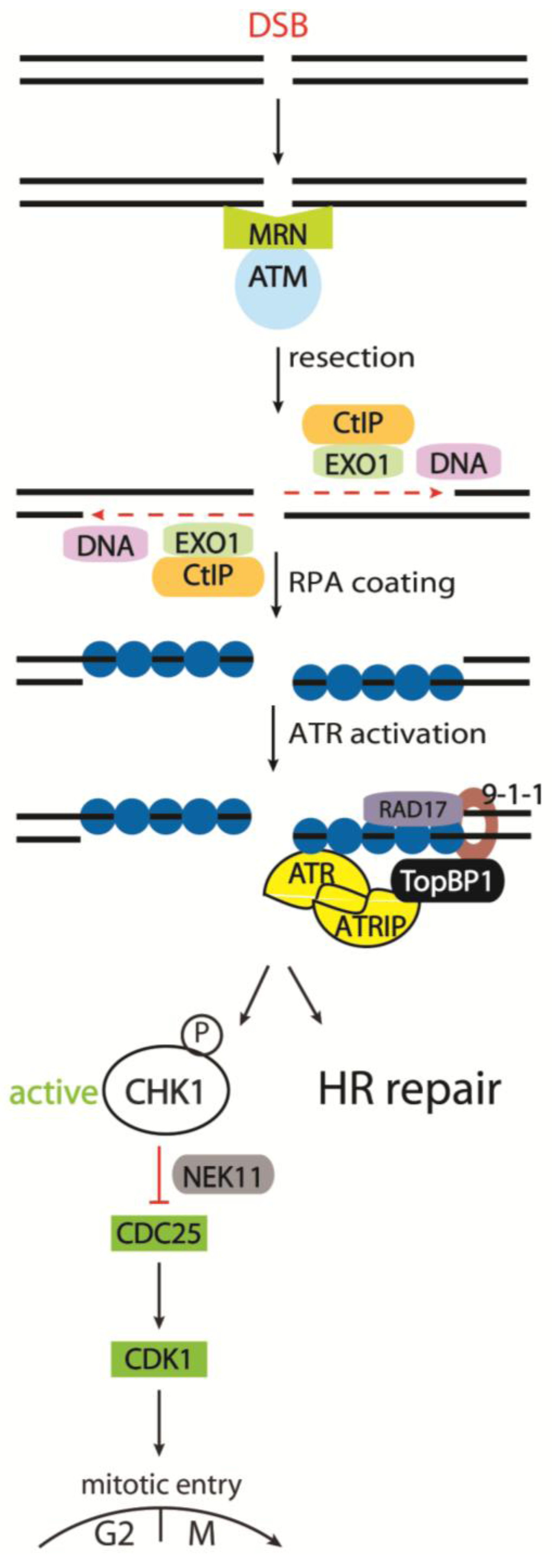 Activation of checkpoint regulator (CHK1) in response to DNA Double Strand Breaks (DSBs). The MRN complex detects DSBs and recruits Ataxia Telangiectasia Mutated (ATM) to initiate checkpoint signaling. During the S and G2 phases of the cell cycle, dsDNA resection can be performed by the nucleases DNA2 and EXO1, together with CtIP. The resulting ssDNA is coated by Replication Protein A (RPA), and is prepared for homologous recombination (HR) repair. Furthermore, ssDNA-coated by RPA recruits the ATR/ ATR interacting protein (ATRIP) complex as well as TopBP1 via the 9-1-1 complex, enabling full ATR activity. ATR then activates a subset of targets, including CHK1. CHK1 can phosphorylate CDC25A in response to DSBs, targeting CDC25A for proteasomal degradation. Since CDC25A is required for CDK1 activity to facilitate mitotic entry, cells arrest in the G2 phase upon CDC25A degradation.