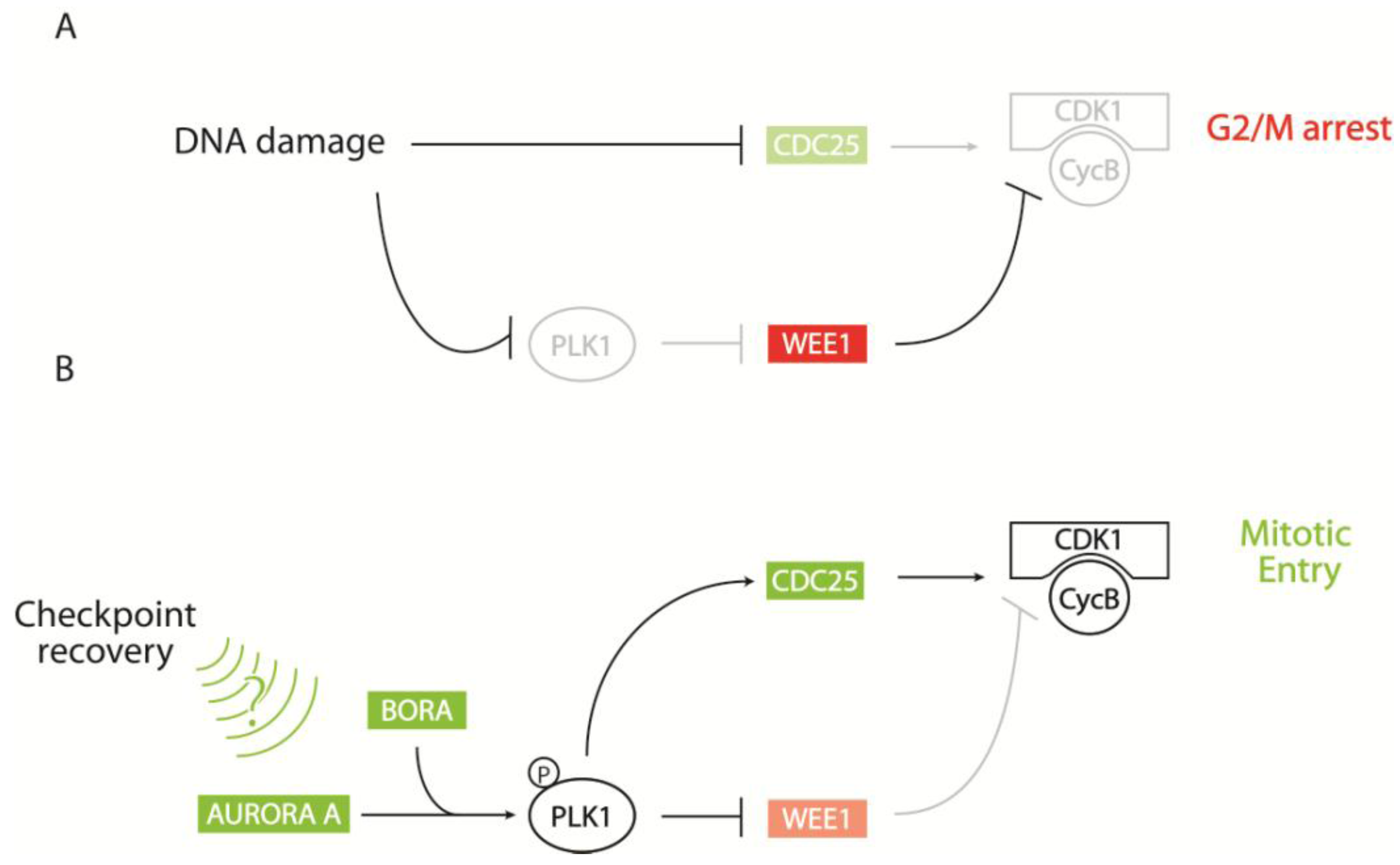 Plk1-dependent recovery from DNA damage induced cell cycle arrest. (A) In response to DNA damage, cells arrest in G2 due to inhibition and degradation of CDK1 activators (like CDC25) and activation of CDK1 inhibitors (like WEE1). (B) Upon DNA damage repair, PLK1 is phosphorylated by AURORA A and BORA in a yet unknown manner. The activated PLK1 in turn phosphorylates the CDK1 inhibitor WEE1, targeting it for degradation, and the CDK1 activator CDC25 to promote its translocation to the nucleus.
