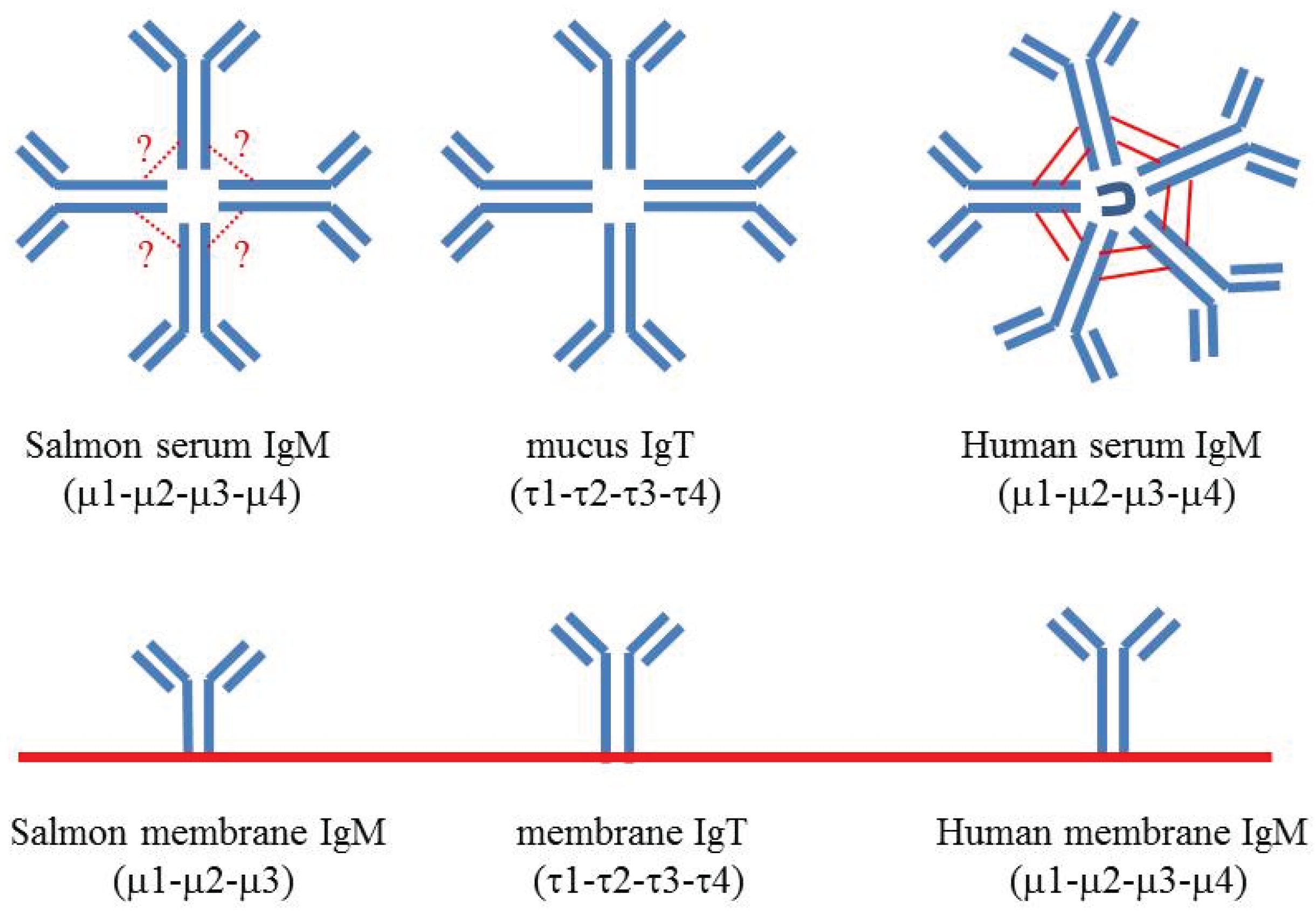 Schematic overview of secreted and membrane anchored IgM and IgT of salmonid fish, compared with human IgM. Serum IgM is a tetramer in teleosts. In contrast to the IgM pentamer in mammals, the monomer units in teleost IgM are loosely linked by disulfide bonding, and the J chain is lacking. Membrane anchored IgM in teleosts is one domain shorter than in mammals as a result of a special splicing pattern which excludes the entire fourth constant domain. Salmonid IgT appears to be non-covalently bonded tetramers in mucus. The similarity between the first constant domains of IgM and IgT is relatively high (52%) in Atlantic salmon, whereas the remaining domains of the heavy chains are only 13%–24% similar [7].