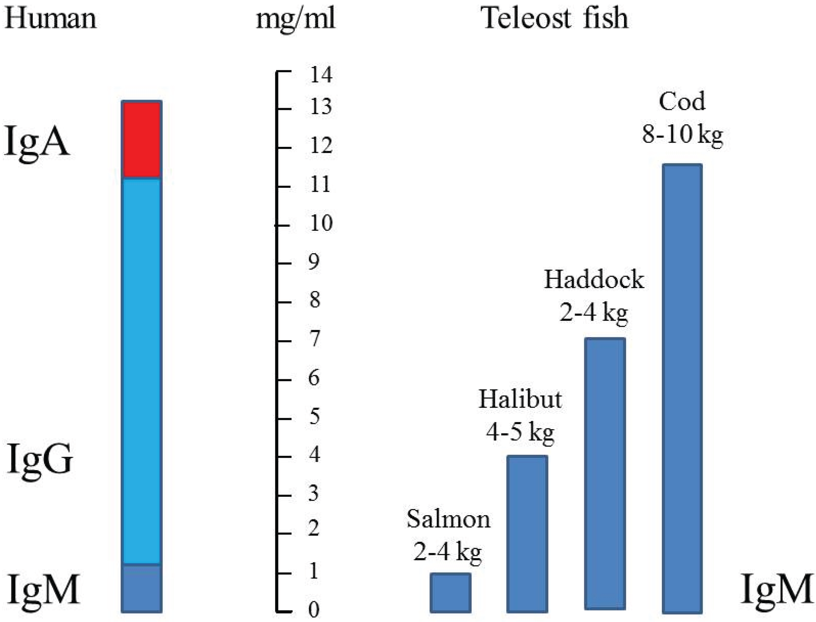 Comparison of serum immunoglobulin (IgM) concentrations in different teleosts [40] compared to human (IgM + IgG + IgA). IgM is indicated with dark blue, IgG with light blue and IgA with red.