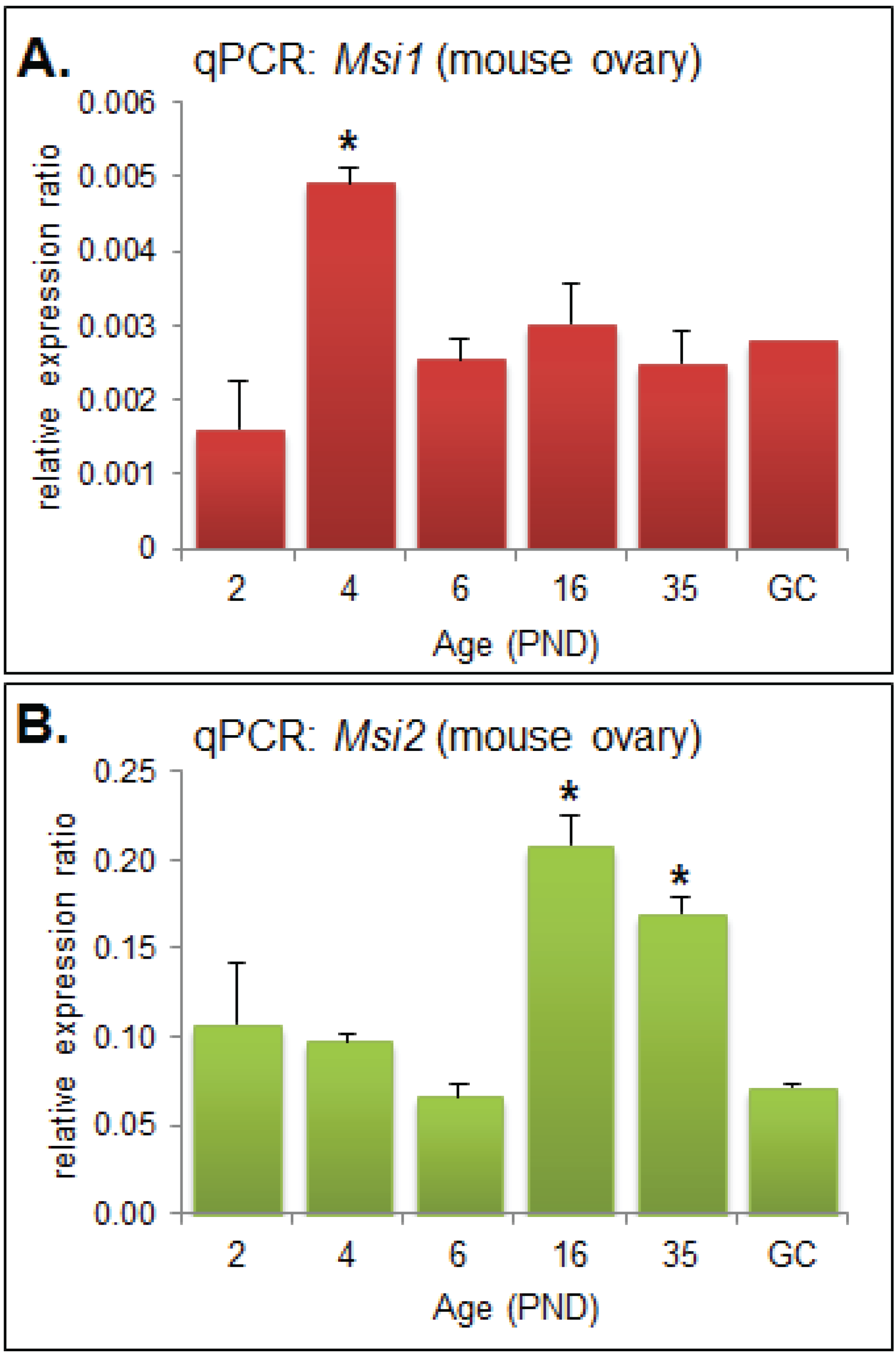 Quantitative PCR (qPCR) was performed on RNA extracted from mouse ovaries and oocytes collected at developmentally important post-natal day (PND) time points [19] in order to observe the steady-state mRNA expression of Msi1 and Msi2. Msi1 steady-state mRNA was most highly expressed at PND4 (p < 0.05), and otherwise detected at relatively low levels for all other time points (Figure 1A). At PND4 the ovary is composed primarily of primordial follicles, with some follicles beginning to activate and transition to primary stage. Msi2 steady-state mRNA expression was significantly enriched at PND16 and PND35 (p < 0.05) relative to the earlier time-points (Figure 1B). PND16 and PND35 mark the transition to sexual maturation; the ovary consists of a higher proportion of growing follicles at advanced pre-antral or antral stage, respectively, and is comprised of an enriched population of granulosa and stromal cells.