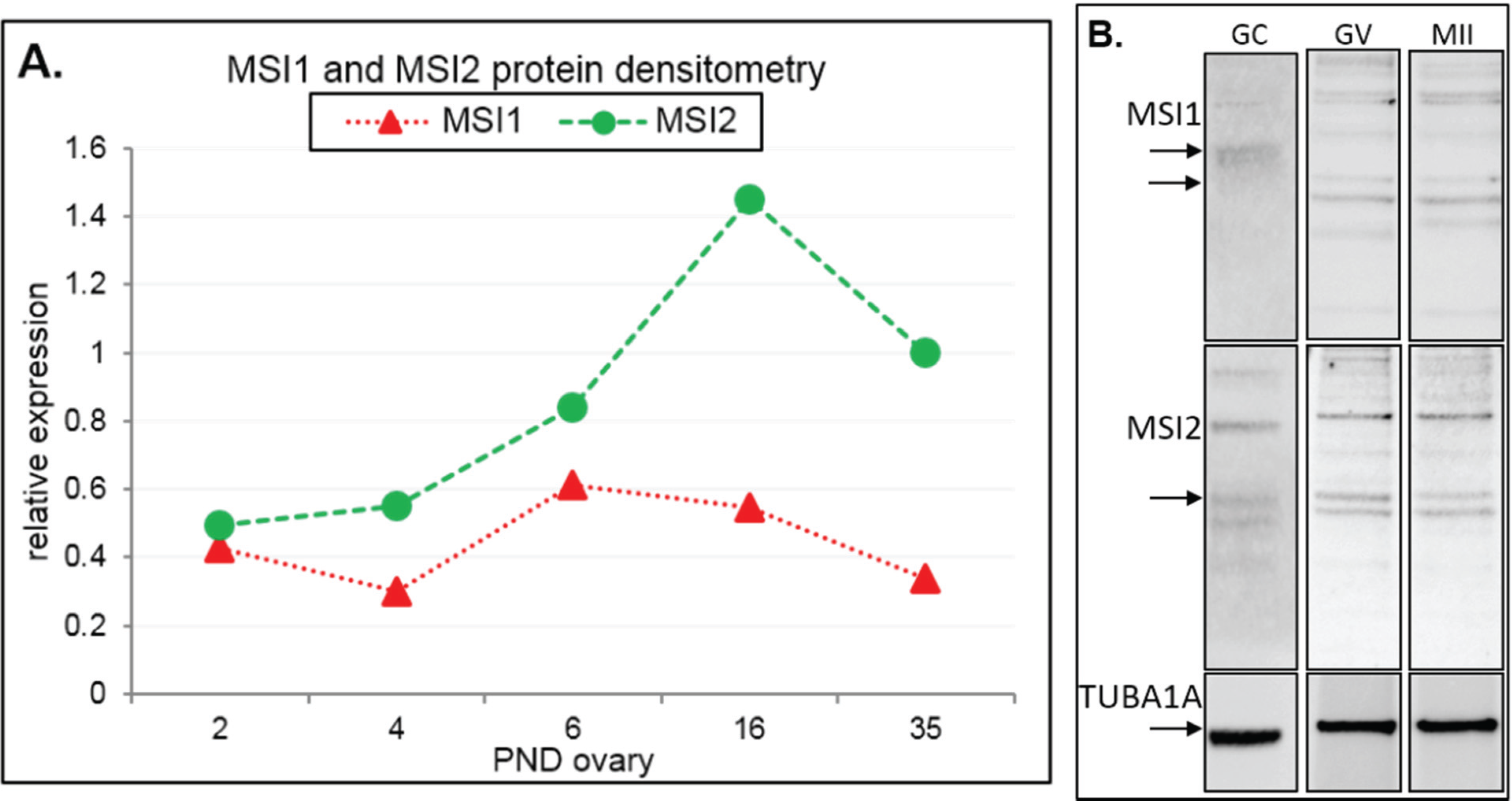 Immunoblot analysis of Musashi during ovary maturation. (A) Protein densitometry of full-length MSI1 and MSI2 in ovary time-course from post-natal day (PND) 2 through to sexual maturity at PND35. Protein expression relative to TUBA1A. For original immunoblots see Supplemental Figure S2. n = 1. (B) Immunoblot of MSI1 and MSI2 in isolated granulosa cells (GC), germinal vesicle oocytes (GV), and in vitro matured metaphase II oocytes (MII). Positive expression of MSI1 was detected at the appropriate size of 39 kDa for isoform 1 and 34 kDa for isoform 2 (only in oocytes). Positive expression of MSI2 was detected at ~37 kDa. Protein expression was measured relative to TUBA1A loading control at 55 kDa. For immunoblots with molecular weight marker, see Supplemental Figure S2.