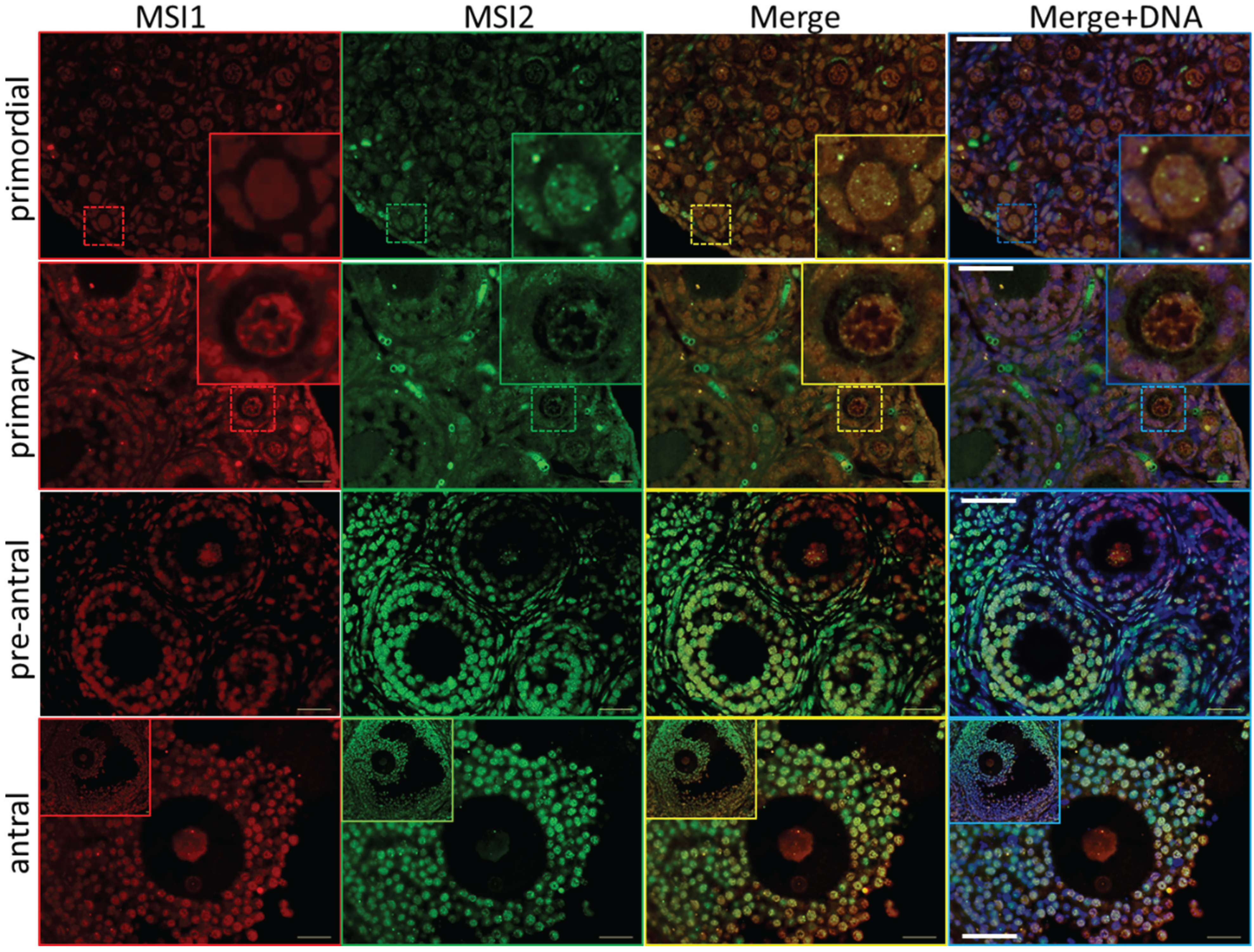 Immunolocalization of Musashi during ovary maturation. Mouse ovary sections were probed for antibodies against MSI1 (red) and MSI2 (green), and counter-stained with DNA marker DAPI (blue). Based on ovary age and follicle composition, images were classified developmentally into primordial, primary, pre-antral, and antral. Sections were visualized via epifluorescent microscopy. Insets in primordial and primary sets show zoomed image of follicle-type. Scale bar in merged images = 40 μm.