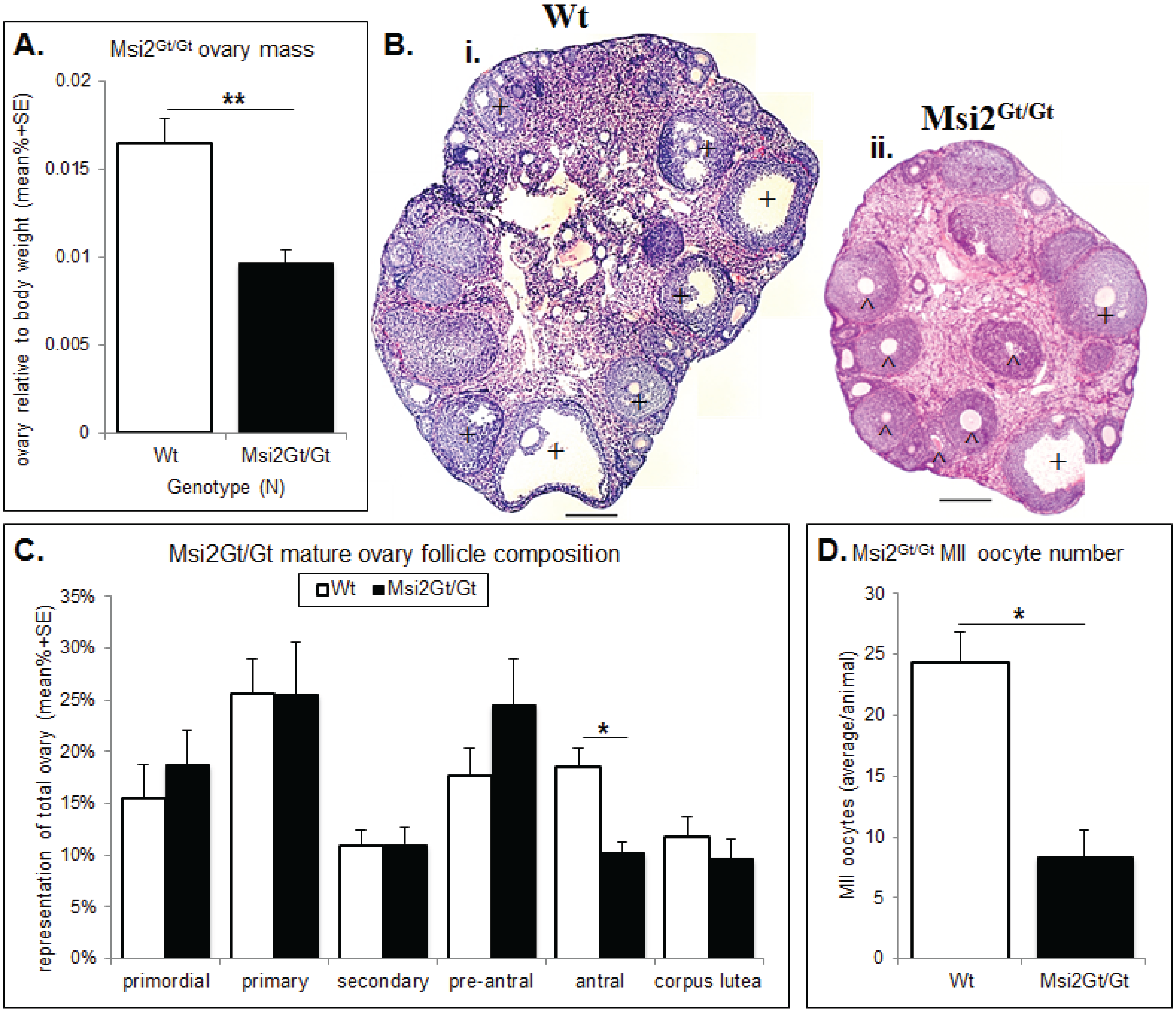 Histological analysis of the Msi2Gt/Gt ovary and oocytes. (A) Mature Msi2Gt/Gt (n = 5) and Wt (n = 8) ovary mass relative to body weight. Value presented as mean relative ovary mass/female/genotype + SE, **: denotes p < 0.01. (B) H & E image of Wt (i) and Msi2Gt/Gt (ii) adult ovary cross-sections. Scale bar = 200 μm. ^ indicates increased # of pre-antral follicles + indicates decreased # of antral follicles in Msi2Gt/Gt ovary relative to Wt. (C) Mature Msi2Gt/Gt and Wt follicle counts, values presented as mean % composition + SE, *: denotes p < 0.05). n = 7. (D) Msi2Gt/Gt (n = 9) and Wt (n = 7) MII oocyte collection counts. MII oocytes were collected from the oviductal ampullae of super-ovulated adult mice and immediately counted, values are average oocytes/animal + SE, *: denotes p < 0.05.