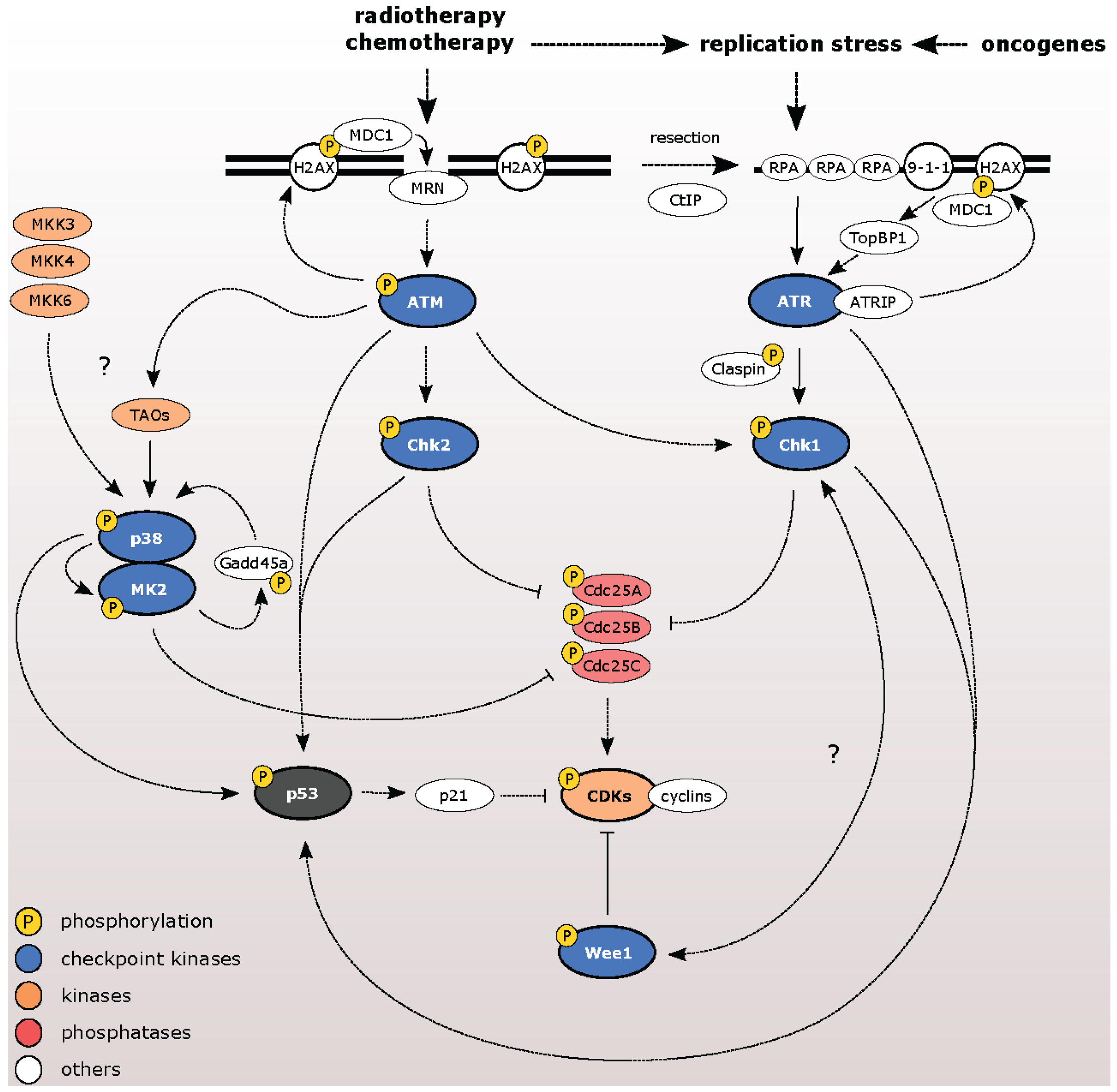 Cells cope with genotoxic stress by triggering a signaling network termed as DNA damage response (DDR) that coordinates the cell cycle progression and DNA repair (Figure 1). Double-strand DNA breaks (DSBs) activate ataxia-telangiectasia mutated kinase (ATM). During S and G2 phases of the cell cycle, DNA flanking the DSB undergoes resection in order to promote error-free repair through homologous recombination (HR). Exposed stretches of single-stranded DNA are coated by RPA that recruits and activates a complex of ataxia-telangiectasia-mutated and Rad 3-related kinase (ATR) with its cofactor ATRIP (reviewed in [1]). In addition, ATR is activated by single stranded DNA (ssDNA) during replication and, to a higher extent, by stalled replication forks during replication stress. ATM and ATR activate checkpoint kinases Chk2 and Chk1, respectively. Cyclin-dependent kinases (CDKs) control progression through the cell cycle and are regulated by inhibitory phosphorylations at residues Thr-14 and Tyr-15 by Wee1 and Myt1 kinases and their dephosphorylation by Cdc25 phosphatases. Phosphorylation and inhibition of Cdc25A/B/C phosphatases by Chk1 and Chk2 leads to efficient inhibition of CDKs and triggers a temporal checkpoint arrest (reviewed in [2]). Aside from canonical checkpoint kinases, the p38MAPK-MK2 pathway also contributes to checkpoint activation. Particularly, MK2 shares substrate homology with Chk1 and Chk2 and can inactivate Cdc25 phosphatases in a similar manner [3,4,5]. The establishment of the checkpoint relies mostly on posttranslational modifications of the effector proteins and, therefore, can occur rapidly after DNA damage. With slower kinetics, DDR activates the tumor suppressor p53 pathway that involves changes in the expression of a large number of target genes. Following DNA damage, p53 is phosphorylated at multiple residues by ATM/ATR, Chk1/Chk2, and p38 and this leads to its stabilization. In turn, p53 triggers transcription of a potent CDK inhibitor p21 that is crucial for the G1 checkpoint. In addition, p21-dependent inhibition of CDK also contributes to the maintenance of the G2/M checkpoint by transcriptional repression of cyclin B and Plk1 [6,7].