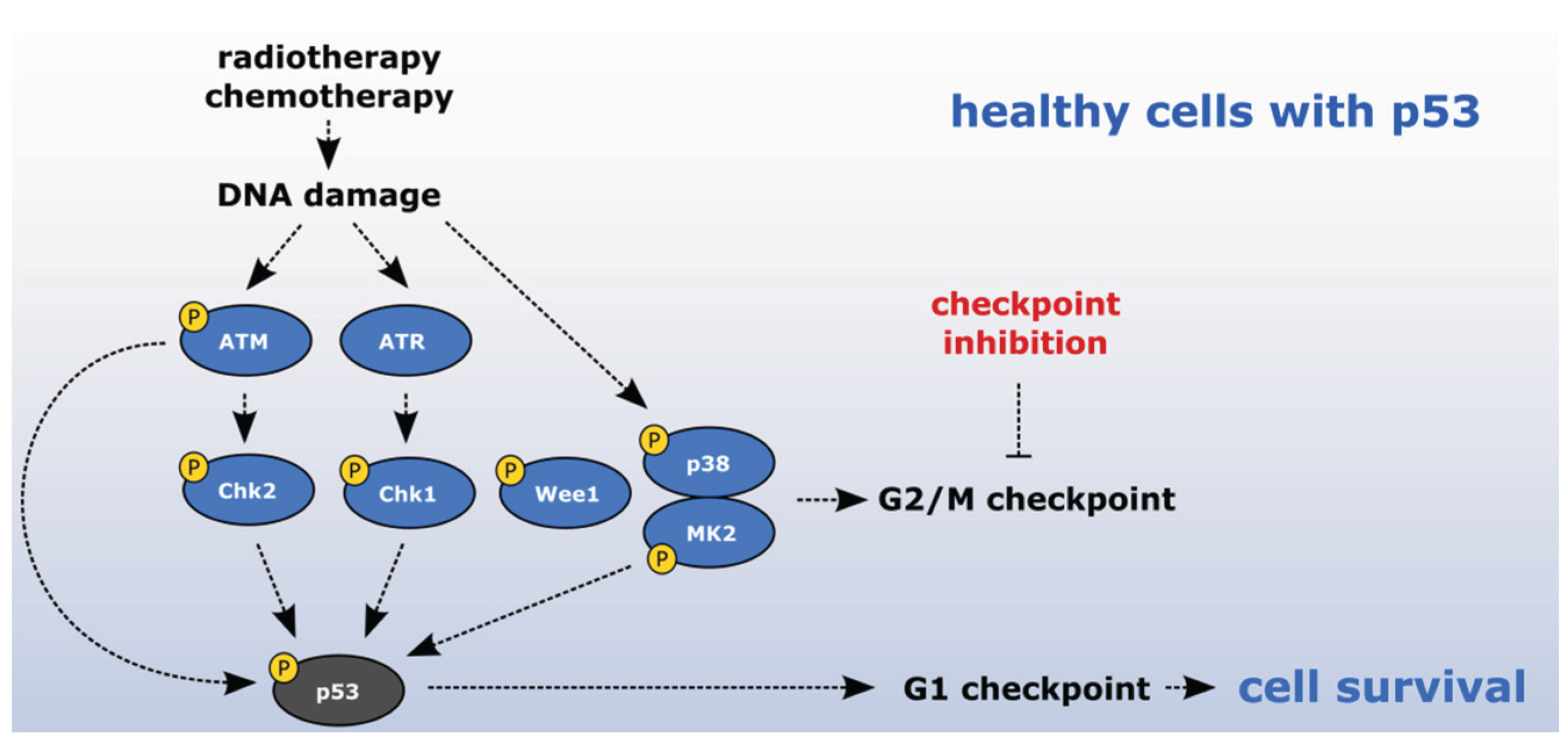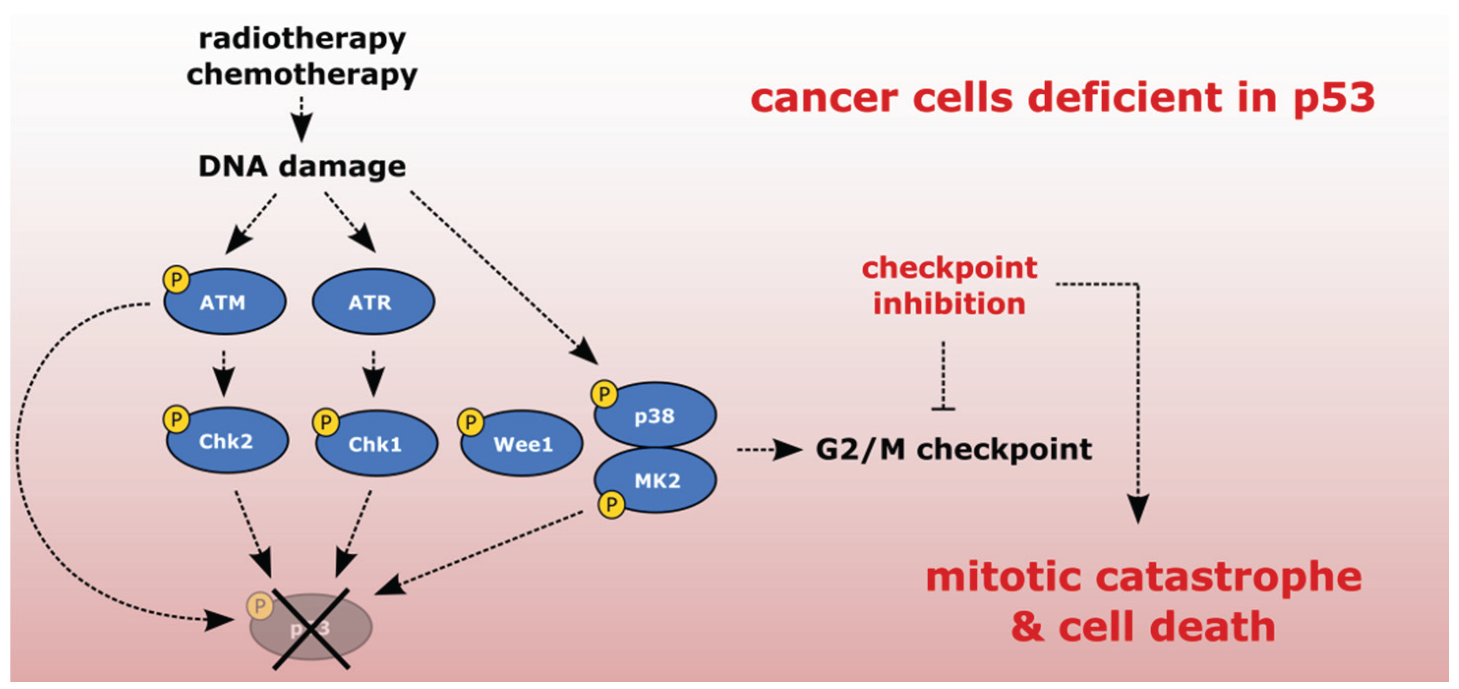 Sensitizing cancer cells to DNA-damaging agents with checkpoint inhibitors. Cancer cells deficient in p53 lack G1 checkpoint and depend on checkpoint kinases to establish G2/M checkpoint. Inhibition of checkpoint kinases in combination with DNA damaging therapy leads to the G2/M checkpoint abrogation, mitotic catastrophe and cell death. Notably, healthy cells are protected by p53-dependent response.
