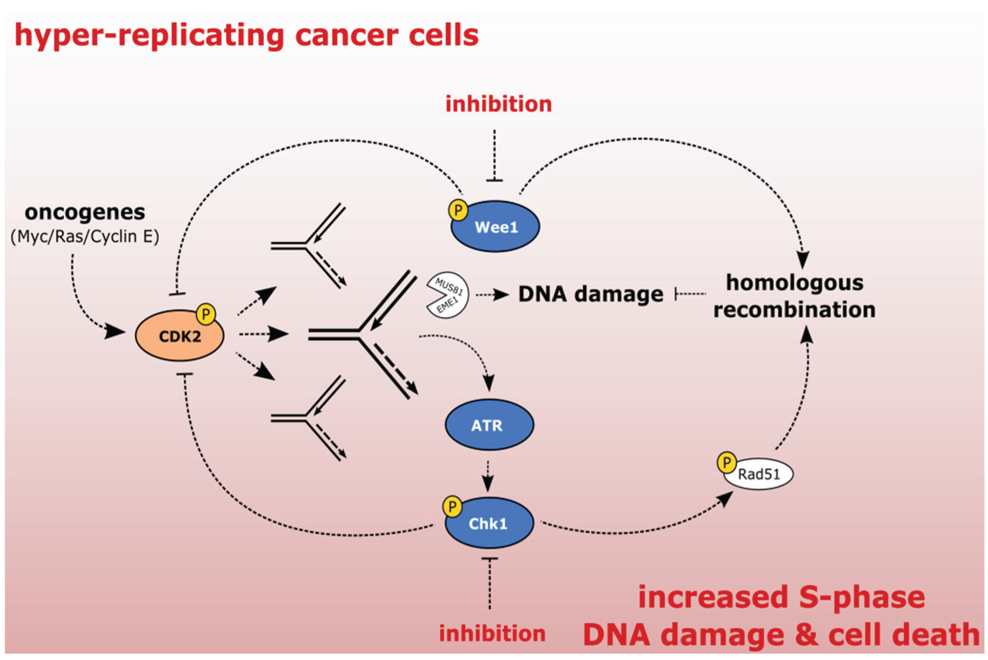 Exploiting the addiction of cancer cells to ATR-Chk1-Wee1 signaling. The activation of oncogenes results in increased CDK activity, hyper-replication, and replication stress. Stalled forks are converted to DSBs. ATR/Chk1/Wee1 kinases oppose CDK2 activation and protect cells from the excessive replication stress. Chk1 and Wee1 protect cells from DNA damage by promoting homologous recombination (HR). Inhibition of ATR/Chk1/Wee1 kinases in cancer cells leads to excessive DNA damage and cell death.