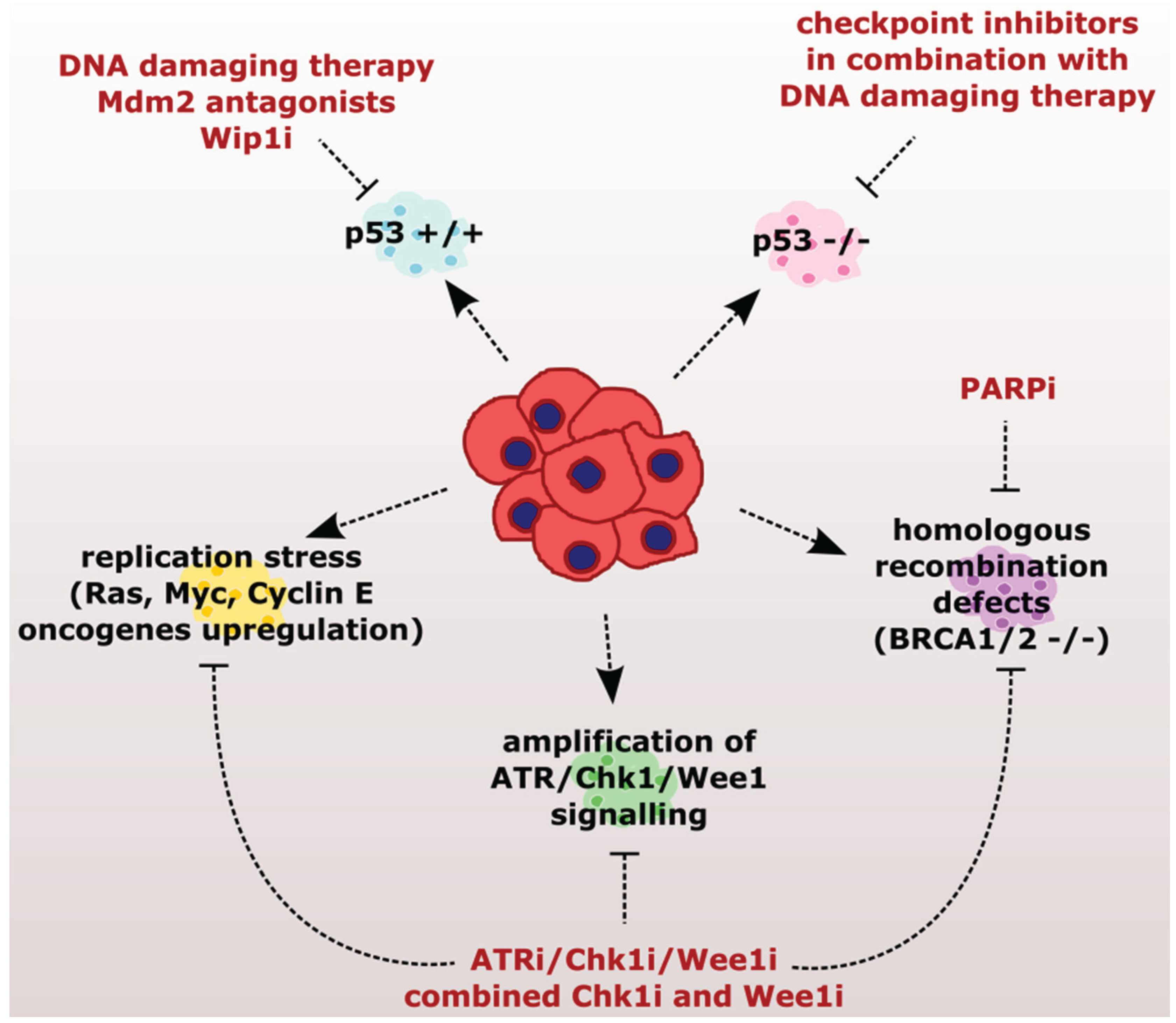 Extensive amounts of preclinical data highlight the potential use of small-molecule inhibitors of the checkpoint kinases for targeted cancer therapy (Figure 4 and Table 1). Encouraged by the efficiency to eradicate cancer cells in vitro and in mouse models, several inhibitors are currently tested in clinical trials. The first approach combines inhibition of the checkpoint kinases with conventional DNA damaging therapies. In this case cancer cells lacking the G1 checkpoint lose the remaining protective effect of the G2/M checkpoint and die by mitotic catastrophe. The efficiency of this approach depends on the status of the p53 pathway and, thus, loss of p53 represents a main predictive marker for the response to the combined treatment with DNA-damaging reagents and checkpoint inhibitors. The second strategy relies on addiction of cancer cells transformed by active oncogenes (such as Ras, Myc or Cyclin E) to ATR, Chk1, and Wee1 kinases that allow them to cope with a high level of replication stress. These cancer cells are more sensitive to the partial inhibition of ATR/Chk1/Wee1 kinases compared to the healthy counterparts. In this case, increased sensitivity does not depend on p53 and, therefore, could be widely used without determining the status of TP53. On the other hand, inhibitors of ATR/Chk1/Wee1 will likely be efficient only in tumors with the high level of replication stress. Therefore, reliable biomarkers of replication stress are needed for prediction of the treatment response. Suitable candidates include histone H2AX phosphorylated at Ser-139 (general marker of genotoxic stress), Chk1 phosphorylated at Ser-345 (active form of Chk1), and Cdc25 phosphorylated at Ser-216 (marker of active checkpoint) that all score positive in cells undergoing replication stress. The positivity of these markers correlated well with the response of the c-Myc-driven large B-cell lymphoma to Chk1 inhibition [170]. The third strategy exploits genetically-determined defects in DNA repair pathways (mostly homologous recombination) that render cancer cells more sensitive to PARP or ATR/Chk1/Wee1 inhibitors. Deficient HR can be deduced from identified inactivating mutations of already known genes (such as BRCA1 or RAD51) in tumor biopsies; however, the major challenge is represented by prediction of the drug resistance development. Finally, tumors that retain intact p53 could be sensitized by increasing p53 levels through antagonizing Mdm2 or by inhibition of Wip1 phosphatase.