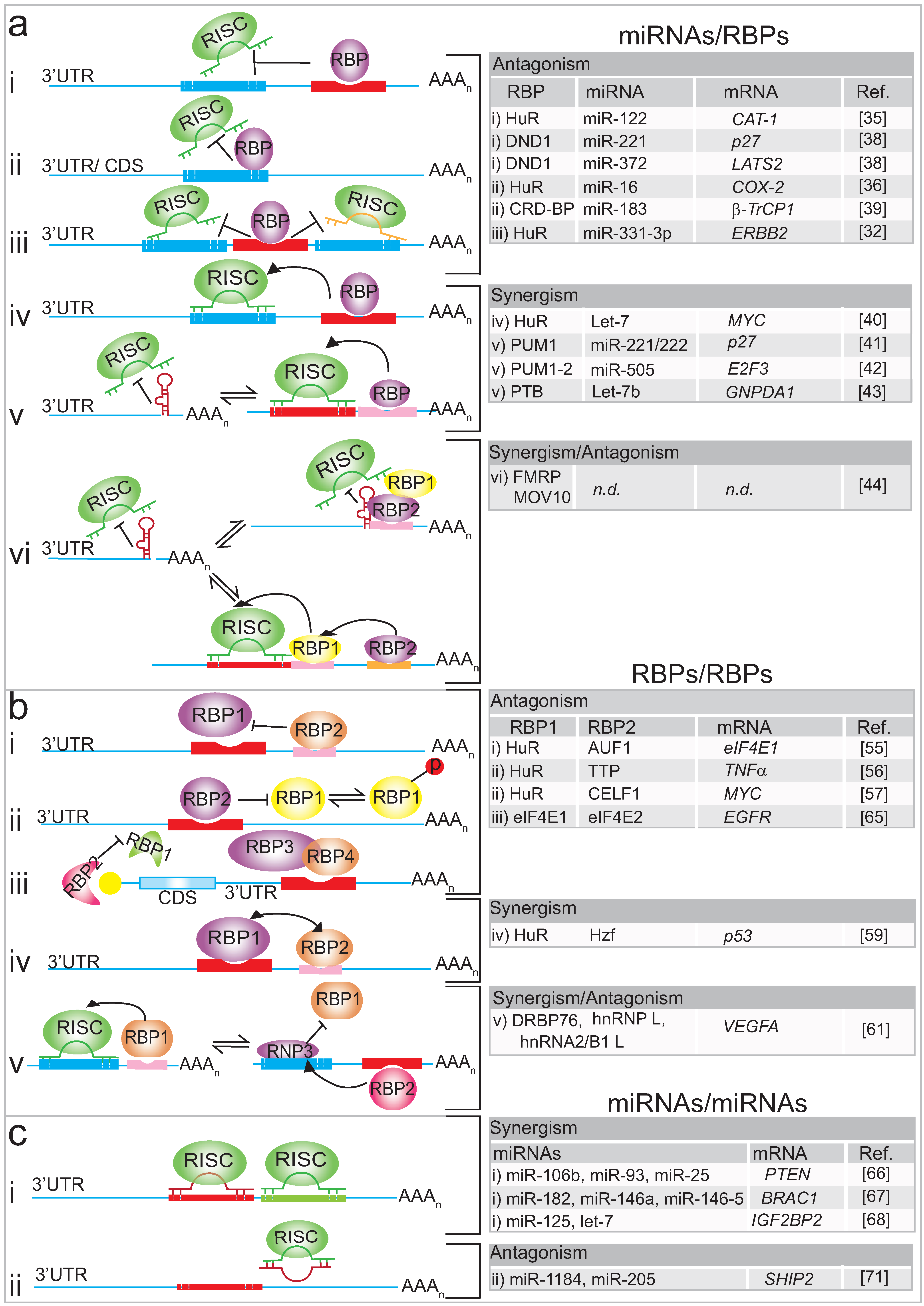 (a) Schematic of crosstalk between miRNAs and RBPs. Upper panel: The antagonistic interplay between RBPs with a mRNA target prevents miRNAs from binding to the transcript. RBP binding can occur next (i) to the miRISC binding site, in between (iii), or overlap in 3'-UTRs or coding sequences (CDS) (ii). Middle panel: Cooperation achieved by RBPs that promote/enable miRISC binding to mRNA targets (iv), thereby altering local RNA structures (v). Lower panel: Antagonistic and synergistic interplay between RBPs, where the miRISC activity on the same mRNA is determined by different combinations of RBPs; (b) Scheme of crosstalk between RBPs and RBPs. Upper panel: Competition of two RBPs for distinct (i) or the same (ii) RNA binding site. Translation initiation factors competing for common feature on the mRNA (cap) (iii). Middle panel: Cooperation between RBPs that promote mRNA export and translation (iv), Lower panel: Complex antagonistic and synergistic interplay between RBPs exemplified on VEGFA mRNA (v); (c) Scheme of crosstalk between miRNAs-miRNAs. Upper panel: Cooperation between different miRISC to enhance the inhibition of expression of the mRNA target (i). Lower panel: Competition between different miRISC to enhance the expression of the mRNA target (ii).