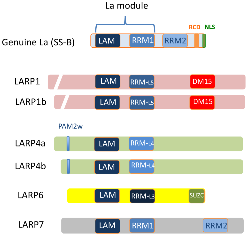 | Pseudonyms | SS-B, LARP3 | LARP1a | LARP2 | LARP4 | LARP5, KIAA0217 | Acheron, ACHN | PIP7S, HDCMA18 |
