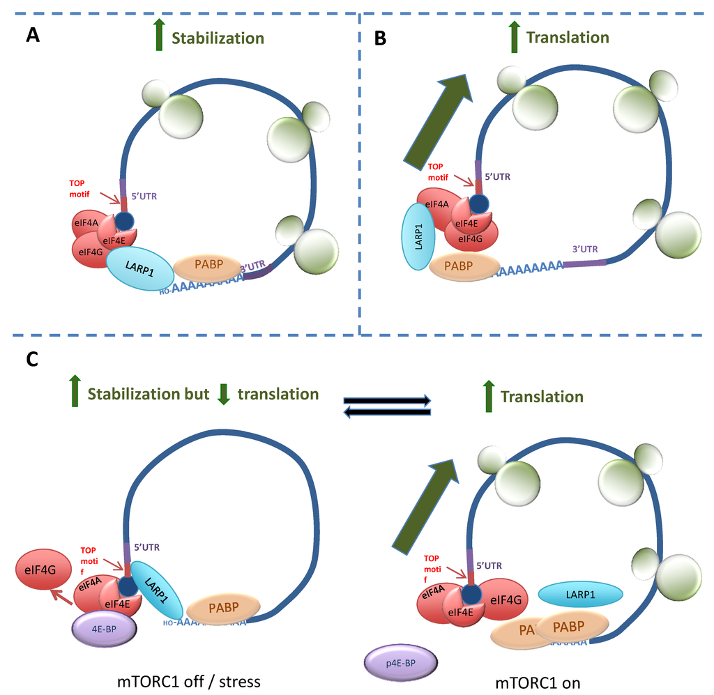 Proposed mechanisms for the interaction between LARP1 and 5'TOPs. (A) Aoki et al. (2013) [] demonstrated that LARP1 independently binds the terminal adenosine of the poly(A) tail of mRNA and, by simultaneously interacting with 5'cap components, circularises mRNA of 5'TOP-bearing transcripts to enhance their stability; (B) Tcherkezian et al. (2014) [] showed LARP1 as associating with 5' cap components via its interaction with PABP. LARP1 is complexed with Raptor, which enhances 5'TOP translation, but it is unclear whether this is functionally distinct from its association with PABP/eIF4F; (C) LARP1 in the mTORC1-regulated phosphorylation-dependent switch mechanism described by Fonseca et al. (2015) []. Upon mTORC1 inhibition or cell stress (“mTORC1 off”), LARP1 displaces eIF4G and binds both to the 5'TOP sequence and the poly (A) tail of TOP mRNA to create a stable “closed loop” which is translationally inactive. When mTORC1 is active (“mTORC1 on”) 4E-BP1 is phosphorylated whereupon eIF4E is released and returns to the eIF4F complex. At the same time, LARP1 (complexed with Raptor) is activated by mTORC1 and binds PABP. The mRNA then assumes an “open-loop” or translationally active conformation.