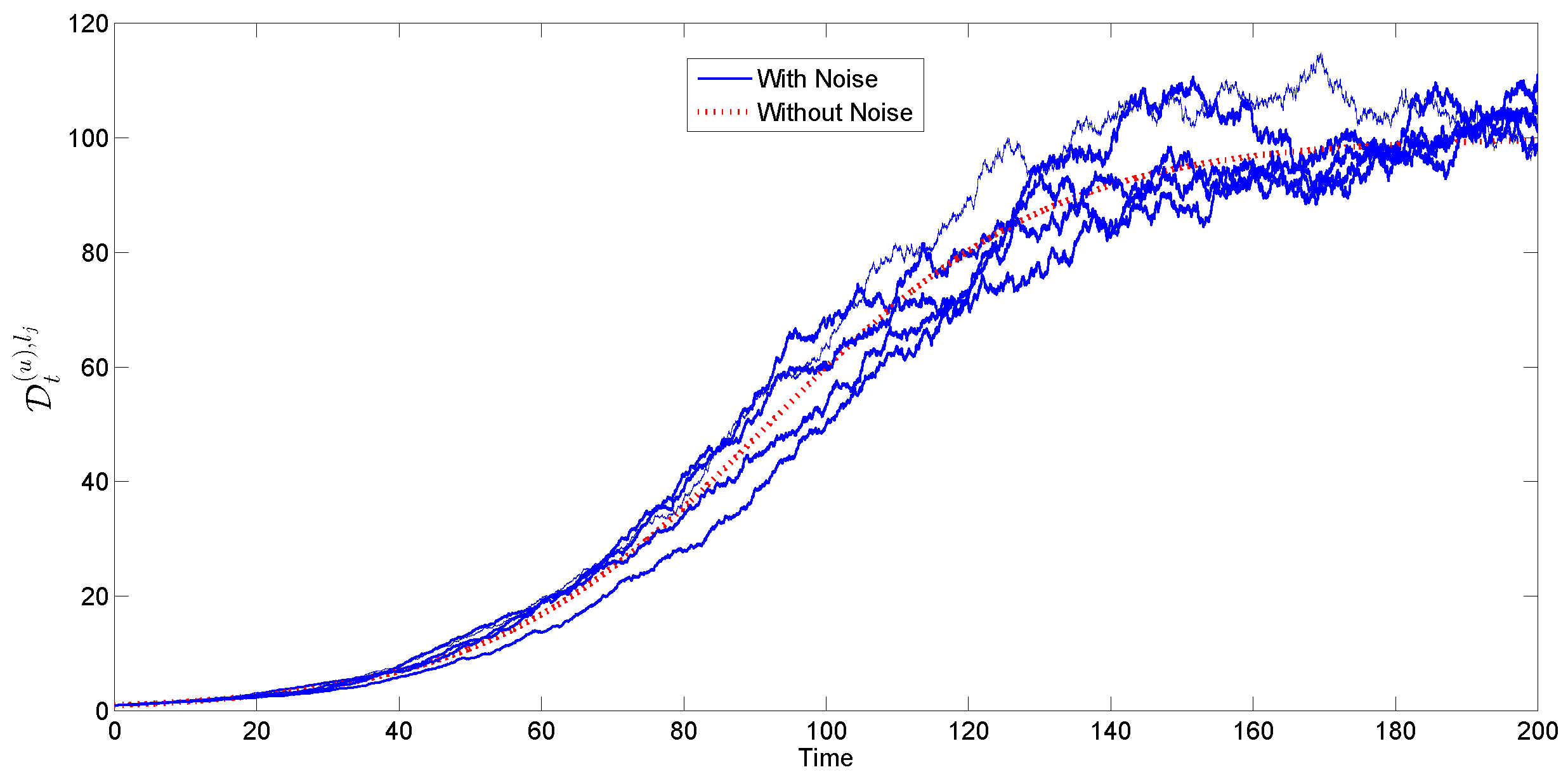 where is the intensity of the growth rate fluctuation, is delta-autocorrelated white noise, i.e., mean zero and randomly changing sign within any short time interval, and “∘” denotes the “Stratonovich calculus”. The explanation of Stratonovich calculus will be given later.