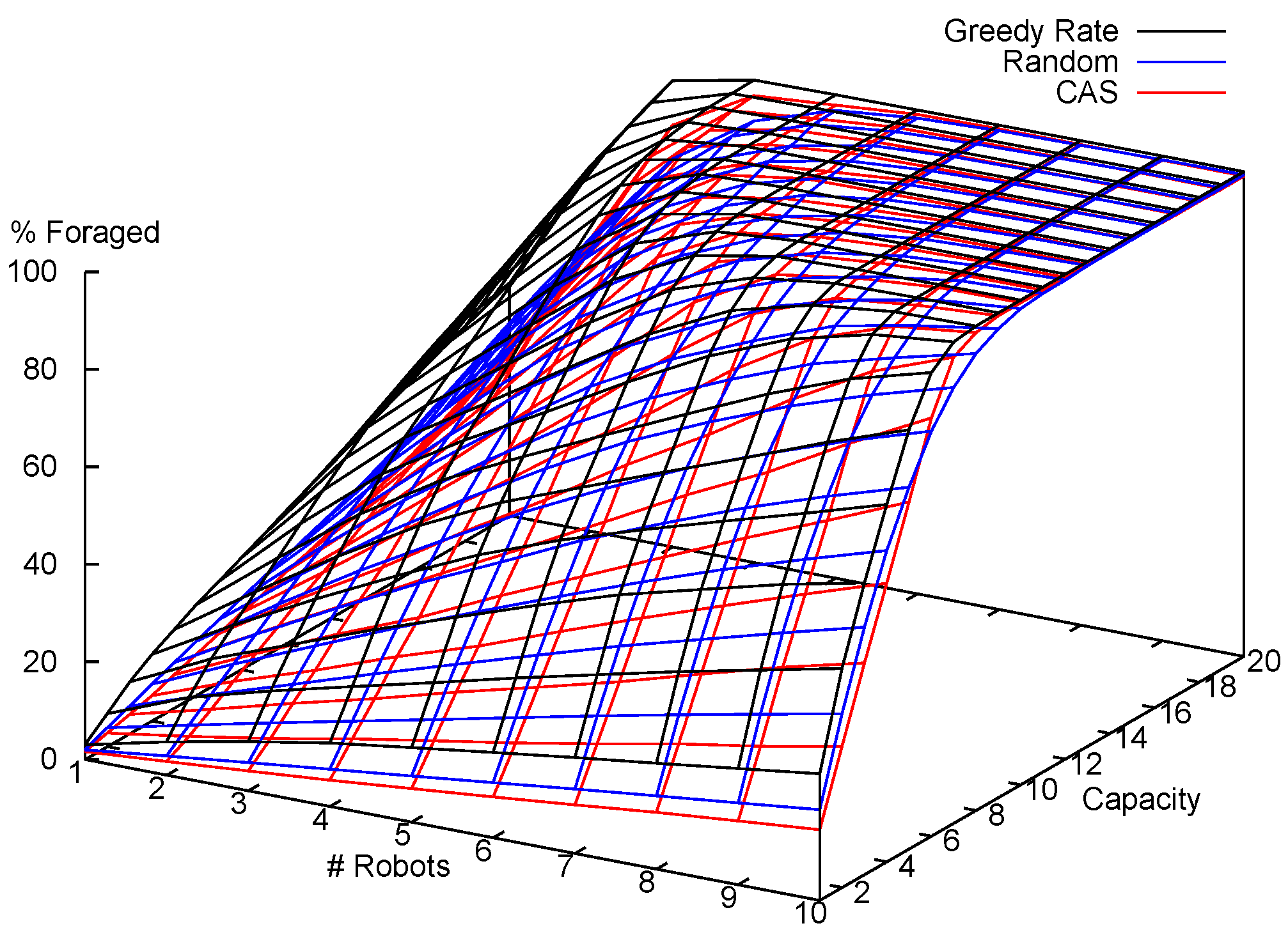 Thus, across the number of robots and capacities of the robots, our greedy rate algorithm outperforms the CAS and random algorithms. As the number of robots approaches 10 and the capacity approaches 20, all of the algorithms approach 100%, which is why we stopped the experiments at those values.