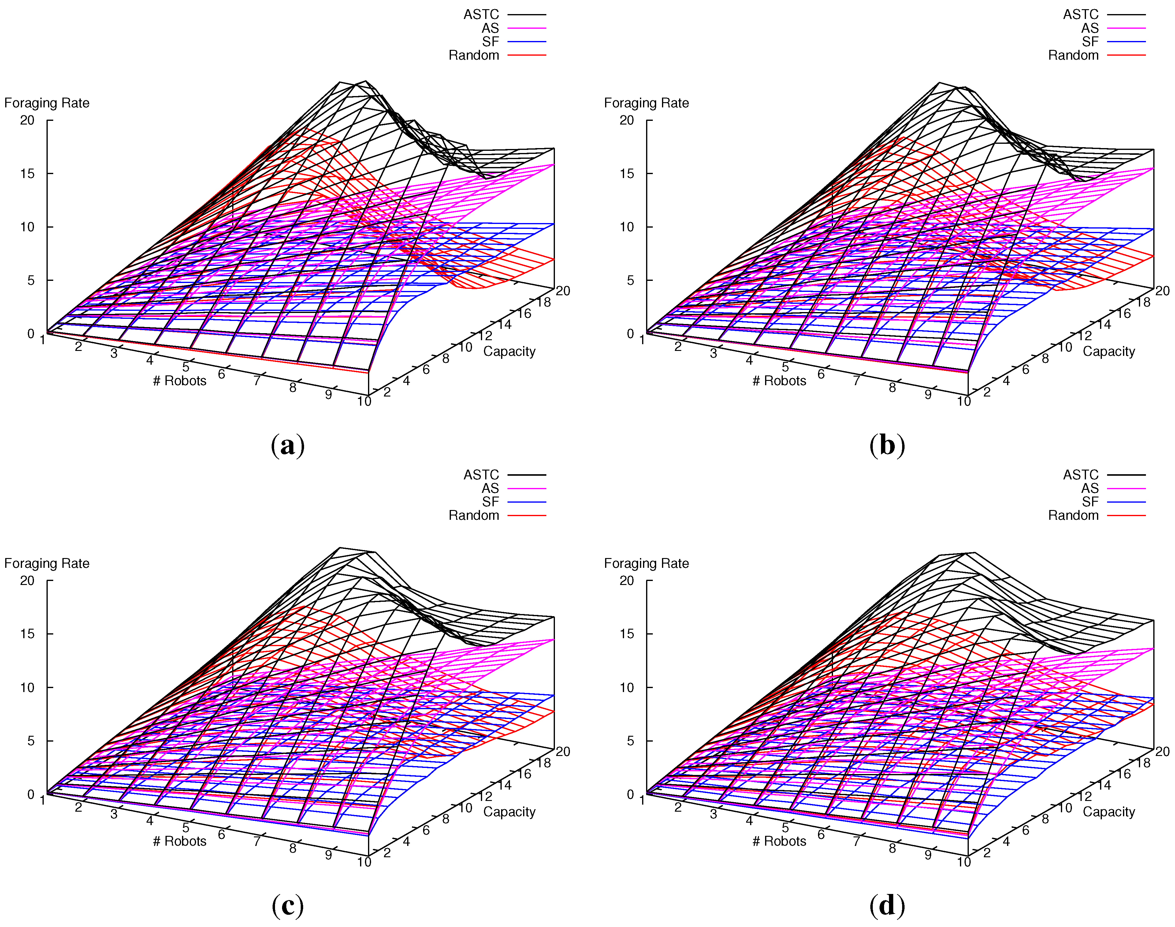Figure 7a–d show the results of the experiments with the stochastic logistic replenishment model, where we varied the process noise . Figure 8 shows 2D slices of Figure 7b, with different capacities. We performed two-tailed Student’s t-tests for the graphs in Figure 4 and found that our ASTC outperformed SF with with capacity = , respectively. Similarly, ASTC outperformed random with , respectively.
