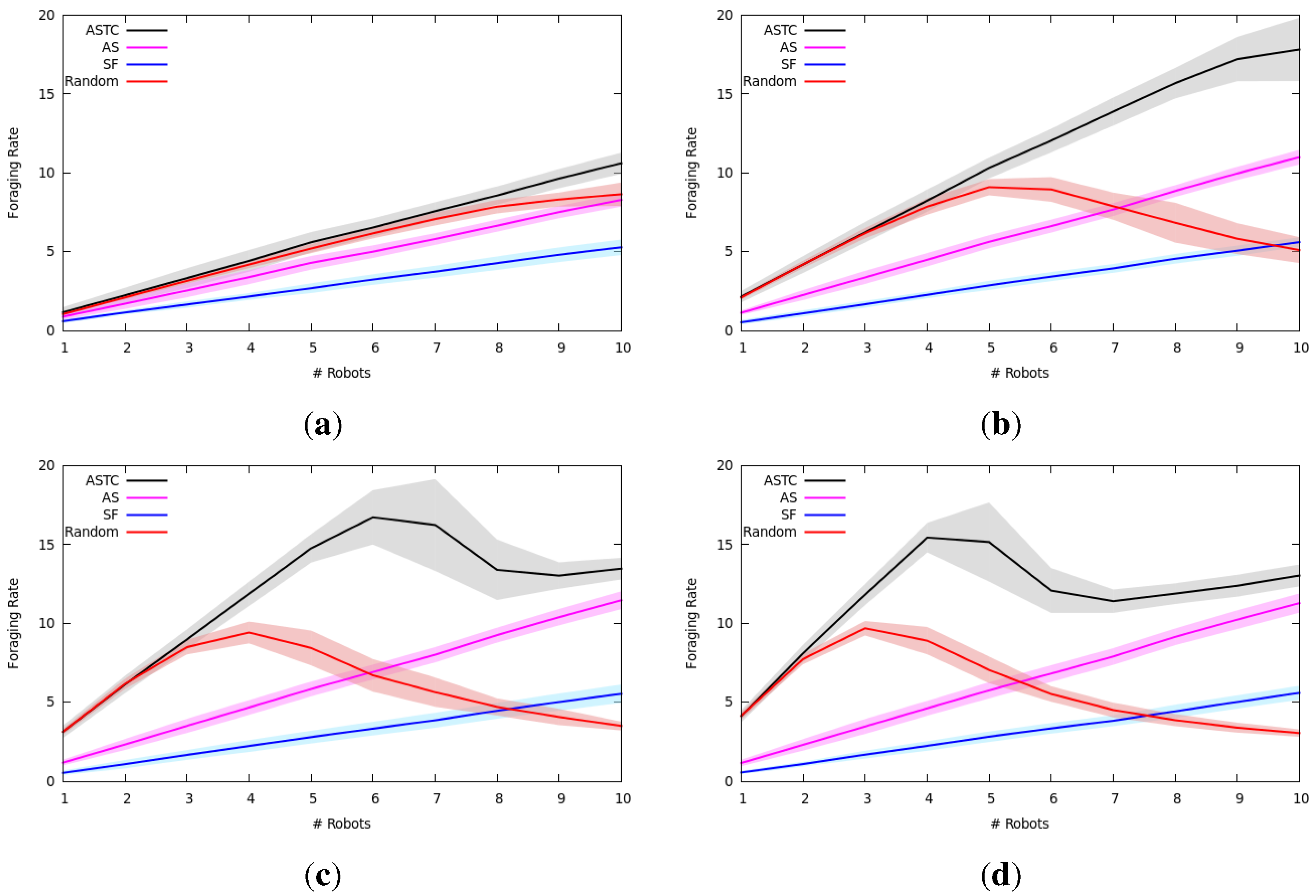 - Castello, E.; Yamamoto, T.; Nakamura, Y.; Ishiguro, H. Foraging optimization in swarm robotic systems based on an adaptive response threshold model. Adv. Robot. 2014, 28, 1343–1356. [Google Scholar] [CrossRef]