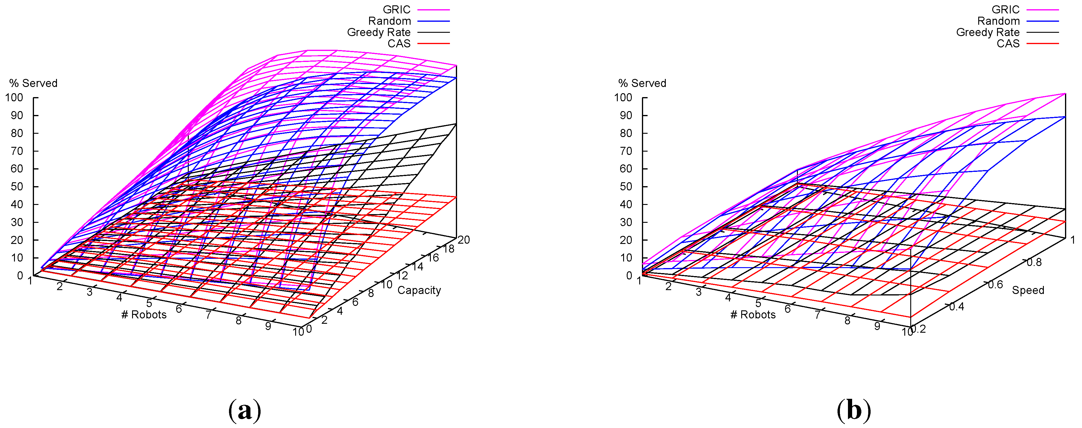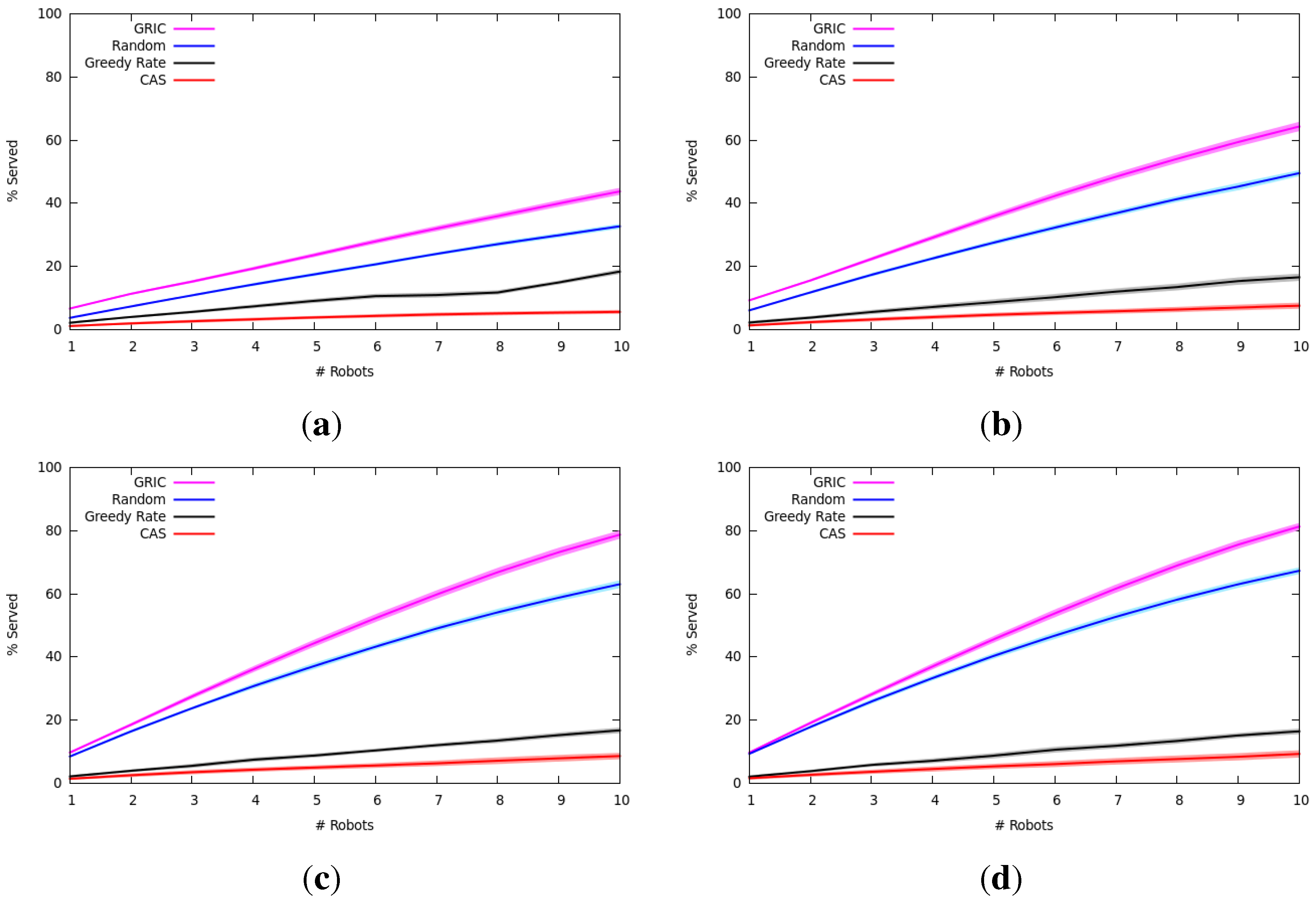 Figure 9a,b show the results of the experiments with the Poisson demand generation model. Our GRIC algorithm consistently serves the highest number of demands, regardless of number of robots, robot capacity or robot speed. Figure 10 and Figure 11 show 2D segments of Figure 9a,b respectively (where the shaded regions around the lines show the standard deviations of the results) and demonstrate that GRIC outperforms GR, random and CAS.