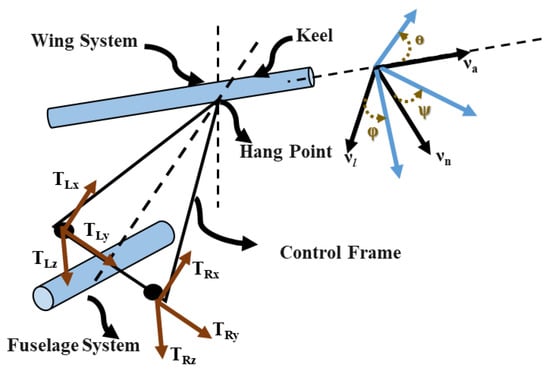 In this framework, the longitudinal and lateral motions are controlled through the force components applied on the control bar of the hang glider [,]. This development takes into account a nine-degree-of-freedom model that considers the kinematic interactions and the constraints between the fuselage and the wing at the hang point, as shown in Figure 1. The longitudinal and lateral dynamics are referred to the wing’s frame, where the forces (nonlinear state equations) at the hang point are substituted for by some transformations in the wing’s frame [].