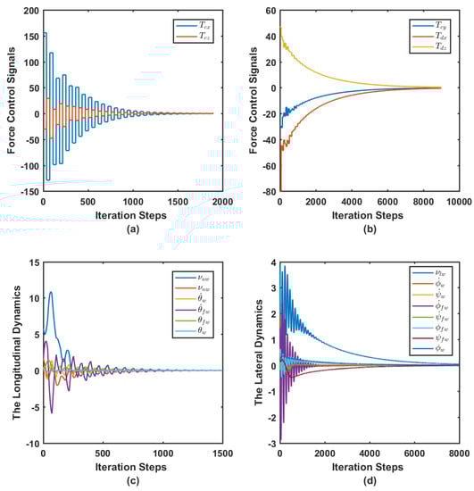 Case I. The longitudinal and lateral force control signals and the dynamics: (a) the longitudinal force control signals; (b) the lateral force control signals; (c) the longitudinal dynamics; and (d) the lateral dynamics.