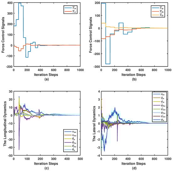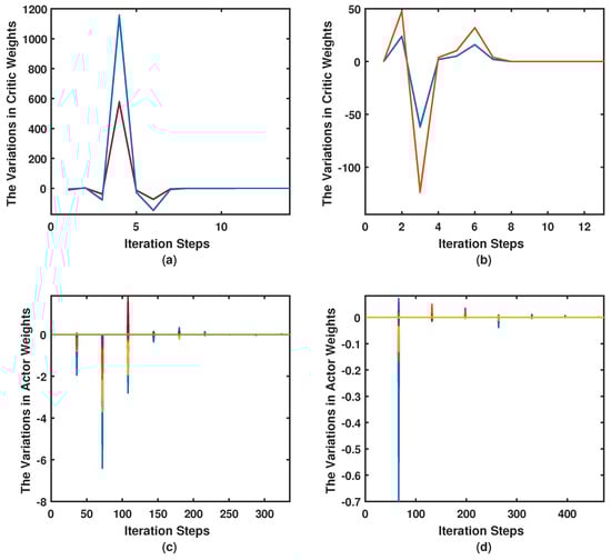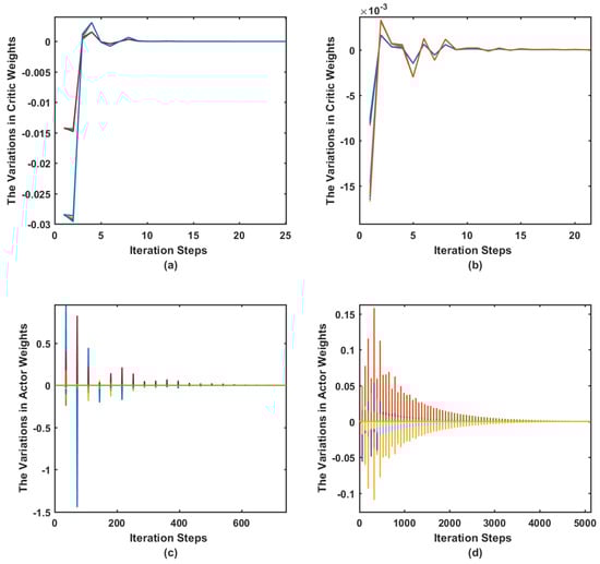 Case II. The variations in the neural networks’ weights: (a) the variations in the actor’s weights for the longitudinal case; (b) the variations in the actor’s weights for the lateral case; (c) the variations in the critic’s weights for the longitudinal case; and (d) the variations in the critic’s weights for the lateral case.