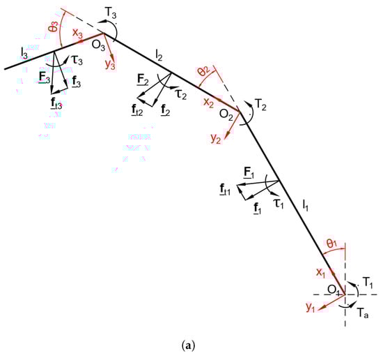 Each finger is driven by the torque delivered by the bevel gear differential stages 2 (fingers and ) or 3 (fingers and V), as shown in Figure 1. Considering the same assumptions made for the two-phalanx finger, the contact forces obtained from Equation (12) are: