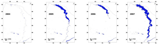 The underlying structure of the Doosti Dam basin’s images, monitored from 2004 to 2021, was investigated (Figure 4). The satellite images reveal a downward trend until 2018. Figure 4 shows the extent of the Doosti Dam’s reservoir in the early spring of the years between 2004 and 2021. As illustrated in Figure 4, the water stored in the dam reservoir has decreased over time from 2013 to 2018, which is a sign of the reduction in water input. During these 18 years, the reservoir has had the lowest area in 2018 and the highest area in the early spring of 2009–10.