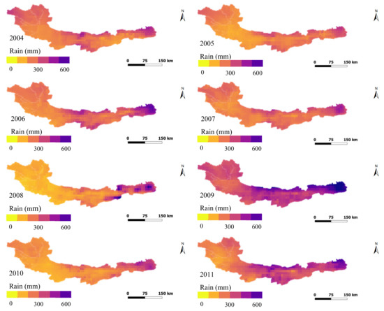 The spatial–temporal distribution of annual rainfall (mm) from the CHIRPS product derived from GEE in the period of 2004–2021.
