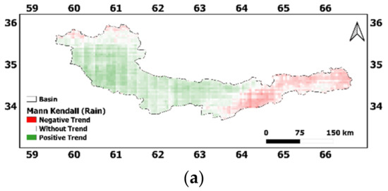 The GEE platform contains a substantial amount of satellite data acquired by other missions and it also hosts other ancillary data such as digital elevation models, vector-based datasets, land cover and meteorological data [56]. Since data hosted by GEE is analysis-ready, the need for pre-processing is circumvented as these data have been found to be consistent over time and well-suited for time series analysis and estimating long-term trends [14]. By applying the date filter function to the image collections, the desired time periods (2004–2021) were separated from the whole datasets. The spatial filter function was used to limit the borders to the Doosti Dam watershed. Then, using the trend functions (Mann–Kendall, Sen’s slope) in GEE, evaluation of the pixel-based long-term spatiotemporal trend for the gridded datasets was carried out to analyse the trend and its intensity. The Mann–Kendall expression (alpha 0.05 and Z statistics = 1.96, generated from the standard normal table) was used to assess the Sen’s slope [57].