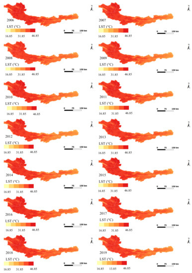 LST is an extremely important parameter that controls the exchange of longwave radiation and sensible heat flux between the Earth’s surface and the atmosphere. Therefore, trend analysis of LST is essential for the study of the hydroclimatology behaviour of basins. Generally, LST products are derived from thermal infrared (TIR) sensors (e.g., AVHRR, MODIS or METEOSAT) [41].