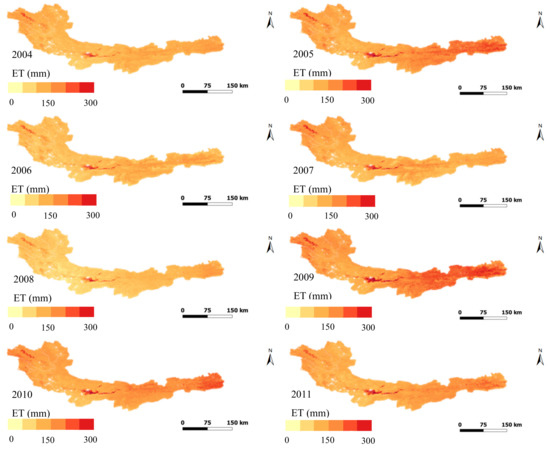 The spatial–temporal distribution of annual evapotranspiration (mm) from the MODIS product (MOD16A2) derived from GEE in the period of 2004–2021.