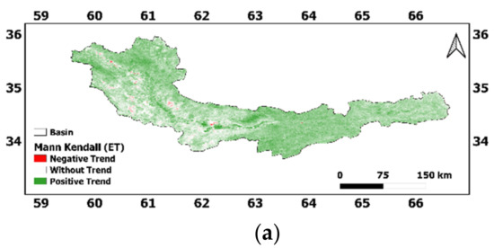 Figure 12 shows the spatial distribution of trends in the annual evapotranspiration based on MOD10A1 estimates for the period from 2004 to 2021. The spatial pattern of the MK test shows that snow cover duration had no significant trend in a large area of the basin (Figure 12a) and in Figure 12c no trend was identified for most of Doosti Dam’s basin; however, the significant trend was recognised upstream.