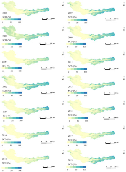 Figure 12b shows a decreasing trend for SCD in the western part of the basin with a Sen’s slope calculation of −0.0012 (lower limit) indicating a downward trend for the significant tendencies at a 95% confidence level.