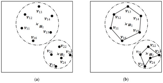 Figure 1 shows an example of modeling the geometry of a feature object using the mark clustering point process. Figure 1a shows the clustering point process. There are two parent processes u = {u1, u2}, represented by “+”. Taking the random point in the parent process (the “+” in the figure) as the center of the circle, two radii r1 and r2 are generated by Gaussian distribution. Generate the corresponding circular area (while generating the radius, ensure that the two circular areas do not intersect, to ensure that the two ground objects do not intersect in geographical location), to generate the sub-process. Each node in the sub-process is represented by “•”. As can be seen from the figure, v = {v1, v2}, v1 = {v11, v12, v13, v14, v15, v16}, v2 = {v21, v22, v23, v24, v25}. Figure 1b shows the mark clustering point process based on Figure 1a. Taking the cluster points in each sub-process in Figure 1a as nodes and connecting them to form a simple polygon as the mark of the corresponding object. It can be seen that in this example, the sub-processes corresponding to the two-parent processes have six and five cluster points, respectively, to generate hexagon and pentagon.