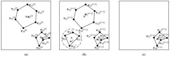 Figure 2 is the examples of adding and deleting polygons, where the Figure 2a shows the geometric configuration w(t) of the ground object at time t. Furthermore, Figure 2b,c show examples of adding or deleting a polygon at time t + 1, respectively.