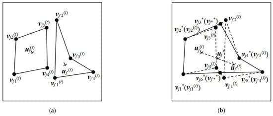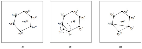 Figure 3 is the example of adding and deleting a polygon node, where Figure 3a shows the geometric configuration w(t) of the ground object at time t. Furthermore, Figure 3b,c show examples of adding or deleting a polygon node at time t + 1, respectively.