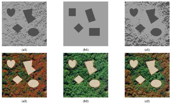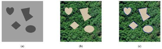 According to the given template image (as shown in Figure 5a), two ground object types of forest land and bare land are spliced to generate a 256 × 256 pixels image (as shown in Figure 5b). The blue line in Figure 5c is the outline of the object.