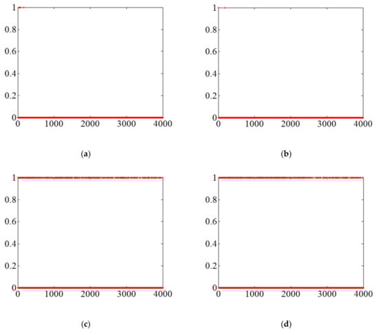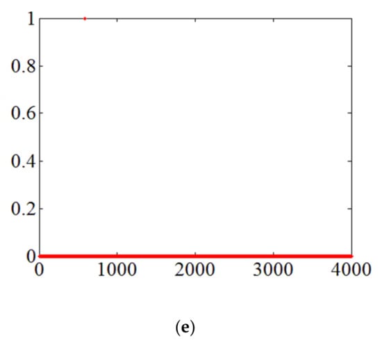 Figure 6 shows the acceptance rate of the last five operations. Among them, the polygon addition operation was accepted four times, which occurred in iterations 26, 49, 62, and 78, respectively, as shown in Figure 6a. The polygon deletion operation was accepted three times, which occurred in iterations 2, 4, and 185, respectively, as shown in Figure 6b. The merge polygon operation is accepted once, which occurs in the 581st iteration, as shown in Figure 6e. These three operations are used to determine the number of objects. Adding and deleting polygon nodes are accepted more times, 683 times and 616 times, respectively, as shown in Figure 6c,d to adjust the geometry of the polygon.