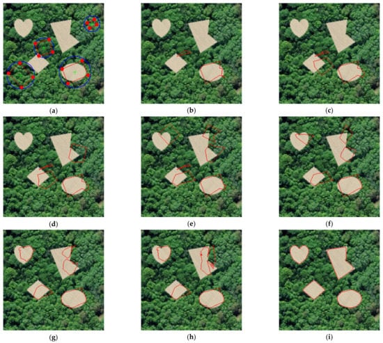 The total number of iterations of the experiment is 4000, and the object extraction results are displayed every 20 times, as shown in Figure 7. Among them, Figure 7a shows the initialization result. During the initialization process, the number of given parent processes is 4, which is represented by the green cross wire in the figure, and the given clustering range is represented by the blue circle in the figure. The sub-processes corresponding to the parent process are generated within the blue circle. The number of sub-processes is set to 4, which is represented by solid red dots in the figure. Connect the sub-processes corresponding to each parent process in sequence to form an initial polygon, as shown by the red line, to form an initialization result. Figure 7b shows the results of the 20th iteration. Compared with the initialization results (Figure 7a), it is found that in the first 20 iterations, the add polygon operation is not accepted, and the delete polygon operation is accepted twice, which occurs in the second and fourth iterations, respectively. Figure 7c shows the results of the 40th iteration. Compared with Figure 7b, it is found that in the 20 iterations, a polygon is added, which occurs in the 26th iteration, and the polygon deletion operation is not received. Figure 7d shows the results of the 60th iteration. Compared with Figure 7c, it is found that in the 20 iterations, a polygon is added, which occurs in the 49th iteration, and the polygon deletion operation is not received. Figure 7e shows the results of the 80th iteration. Compared with Figure 7d, it is found that in the 20 iterations, the polygon addition operation is accepted twice, which occurs in the 62nd and 78th iterations, respectively, and the polygon deletion operation is not accepted. Figure 7f shows the results of the 200th iteration. Compared with Figure 7e, it is found that one polygon deletion operation is accepted, which occurs in the 185th iteration. Figure 7g shows the result of the 580th iteration. Compared with Figure 7f, the operations of adding and deleting polygons are not accepted, but the geometry of polygons is adjusted by adding and deleting polygon nodes. Figure 7h shows the results of the 600th iteration. Compared with Figure 7g, it is found that a polygon merging operation is accepted, which occurs in the 581st iteration. The polygon geometry is adjusted by continuously adding and deleting nodes to form the final object extraction result, as shown in Figure 7i. It can be seen that after adding, deleting, and merging polygons, the final number of polygons is consistent with the object number of figures.