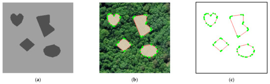 The final experimental results are shown in Figure 8, in which Figure 8a is to convert the object extraction results into segmentation results in order to quantitatively evaluate the experimental results by using the confusion matrix method. Figure 8b shows the superposition results of the extracted ground object contour and the experimental image to qualitatively evaluate the experimental results. Figure 8c shows the extracted contour line of the ground object. The solid green dots in the figure represent each node, and the solid red lines are used to connect each node in order to form a polygon. According to the final experimental results, the central, quadrilateral, pentagonal, and elliptical objects are connected by 23, 13, 23, and 21 nodes, respectively.