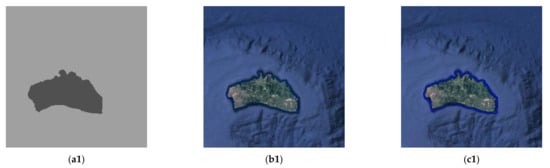 In order to avoid the over-idealization of quantitative analysis of experimental results using only synthetic images, two real remote sensing images [] with islands and lakes as objects are selected for the ground object extraction experiment. The boundary line is determined by visual analysis through human observation. Because there will be some errors in the object boundary line determined by human vision, only the remote sensing image with one object is selected in the experiment. As shown in Figure 10, Figure 10b1,b2 are remote sensing images of islands and lakes, respectively. Figure 10c1,c2 are the manually determined object boundaries (solid blue line in the figure). Figure 10a1,a2 are standard image templates for artificially determined object boundaries to quantitatively evaluate the experimental results.